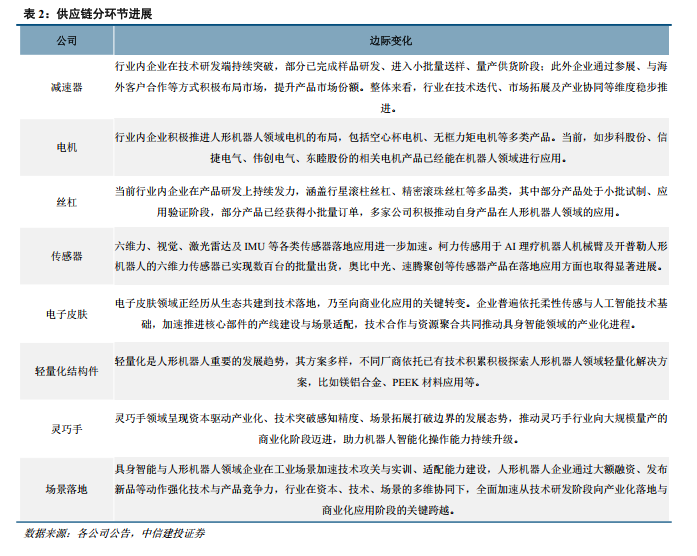 机器人供应链各环节协同突破,产业化进程全面加速。当前人形机器人核心零部件供应链呈现整体协同发展态势,不同环节进展节奏不同,但产业链整体正从技术研发向规模化制造与生态构建全面过渡。