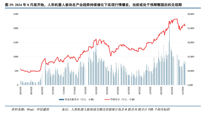 人形机器人板块关注核心从主题投资到量产预期。人形机器人指数相对涨跌主要受到T链进展(性能迭代、硬件定型、量产指引)影响。特斯拉于2025Q3财报业绩会表示,V3在量产制造方面进行明显改进,计划在2026Q1展示Optimus量产意图原型机;之后会去建设百万台Optimus生产线,希望能在明年年底前启动生产。Optimus Gen3的发布推迟到明年,但仍然不改人形机器人产业化落地的确定性趋势,板块核心已经从主题投资逐步向量产预期切换,核心关注供应链确定性以及硬件新方案。