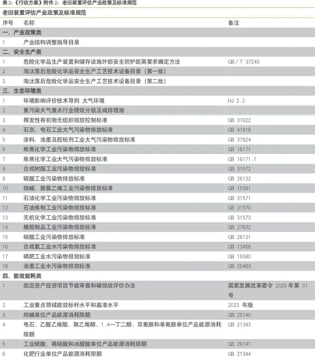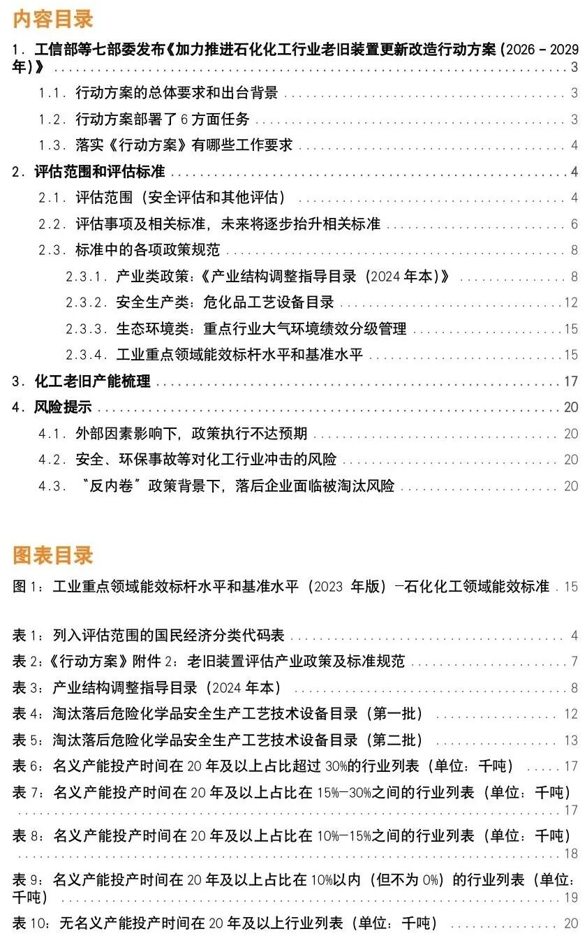 《行动方案》要求:“到2029年,各地2025年已确定的石化化工老旧装置更新改造任务全面完成,2026年后新确定的更新改造任务按计划推进,老旧装置安全环境风险大幅降低,减污降碳协同取得积极成效,优于标杆水平的产能比例显著提升,智能化、绿色化水平大幅提高。年度滚动摸底评估、持续改造提升的长效工作体系不断健全,标准引领和政策协同效应进一步发挥。”石化化工行业是国民经济的重要基础产业、支柱产业,经济总量大、产业关联度高,对稳定经济增长、保障能源和产业链供应链安全具有重要作用。经过多年发展,我国已成为全球最大的石化化工产品生产国和消费国,2025年石化化工行业增加值占工业的13.7%,炼油、乙烯、合成树脂等20多类基础化学品产能居世界首位,有效发挥稳定工业经济压舱石作用。但部分早期建成的装置设计和建设标准低、工艺落后、自动化控制水平不高,存在安全环境风险大、布局不尽合理、装置运行效率低等问题,随着时间推移,老旧装置数量还将持续增加,风险也将不断积累放大,影响行业平稳运行和高质量发展。出台《行动方案》,旨在通过建立年度滚动摸底评估、持续改造提升的长效工作体系,健全支撑老旧装置科学评估和对标改造的标准体系,加大政策资金支持力度等措施,着力解决更新改造项目落地难、融资难等突出问题,更好激发企业内生动力,全面推进石化化工行业老旧装置改造升级,推动行业高质量发展。《行动方案》围绕更新改造工作全过程管理,部署了6方面任务:一是开展摸底调查和评估。各地将实际投产运行超过20年的生产装置逐一登记造册,形成老旧装置清单;对照产业政策、标准规范等进行评估,分类提出处置意见,形成更新改造工作台账。对经评估不需要更新改造的老旧装置每3年开展一次复核,实施更新改造装置的首次复核时间可延长至改造完成后的第6年。二是制定更新改造方案。各地督促指导有关企业“一企一策”制定更新改造实施方案,明确更新改造措施、工作目标、进度安排等,更新改造工作完成时间原则上不超过5年。应急管理部、工业和信息化部、国务院国资委、市场监管总局联合印发的《化工老旧装置淘汰退出和更新改造工作方案》(应急〔2024〕49号)确定的相关事项,按照原计划和要求执行。三是推动提质升级。鼓励更新改造企业对标行业先进水平实施安全化、绿色化、智能化改造,加快先进技术推广应用以及工业软件、工业控制系统更新替代。整体新建项目应按要求达到能耗限额标准先进值或能效标杆水平、环保绩效A级水平,涉及高耗能、高碳排放项目应按要求实施能耗和碳排放等量或减量置换。加强老旧装置运行的日常管理,严格更新改造过程的安全环保管理。四是优化项目管理。在研究重大石化项目布局时,优先支持老旧装置改造提升。鼓励地方建立完善绿色通道,加强要素保障,优化项目备案(核准)、环评、用地、取水、节能审查和碳排放评价、安全许可等办理流程,提高审查审批效率,加快推进项目落地。五是做好验收管理。各地督促指导企业按照“一企一策”方案完成更新改造项目建设,企业应按照有关法律法规要求组织进行竣工验收,生态环境、应急管理等有关部门依法依规对验收情况进行监督检(核)查。六是强化标准引领支撑。实施老旧石化化工装置标准提升专项行动,聚焦安全提升、绿色转型、数智改造、性能升级等方向,建立覆盖老旧装置更新改造各项要求和各个环节的标准体系,全面支撑和引领老旧石化化工装置更新改造工作。我们将上述6方面任务进行总结:《行动方案》针对运行超过20年的老旧装置进行全面、滚动摸底,对照安全化、绿色化(环保、能耗、碳排)、智能化等产业政策和标准“一企一策”提出更新改造方案,以5年为周期完成升级改造,并通过标准提升专项行动全面提升行业标准。为确保《行动方案》主要目标和工作任务顺利完成,提出3方面工作要求。一是加强组织领导。各省级有关部门依据职责做好老旧装置更新改造相关工作,国务院有关部门加大政策支持、加强工作指导。有关中央企业总部要积极履行央企责任,加强技术支持和资金保障,督促指导所属企业按照属地有关部门要求保质保量完成老旧装置更新改造工作任务。二是落实财政金融支持政策。利用现有资金渠道支持符合条件的老旧装置设备更新改造。发挥有关政府投资基金作用,为企业提供投资支持。鼓励金融机构按照产业布局和产能调控方向,落实好有扶有控的信贷政策,通过信贷市场服务平台、国家产融合作平台等推进银企对接,提升金融服务质效。鼓励地方利用现有资金渠道,对老旧装置更新改造予以支持。中央企业年度考核评价应适当考虑老旧装置更新改造对经营业绩的影响。三是强化督促落实。定期调度工作进展情况,做好跟踪分析和通报,及时总结推广典型经验做法,对工作扎实、成效显著的予以表扬激励,对工作不力、进度滞后的及时督促整改。《行动方案》针对老旧装置安全评估范围进行划分:包括《国民经济行业分类》(GB/T 4754-2017)中 25 大类的 251,252中2521(仅包括焦化企业焦油、焦炉气生产化工产品)、2522、2523;26大类的261,262中2621、2622、2623、2624、2629,264中2641、2642、2643、2644、2645、2646,265,266中2661、2662、2663、2664、2665、2666、2669,268中2684(仅包括合成