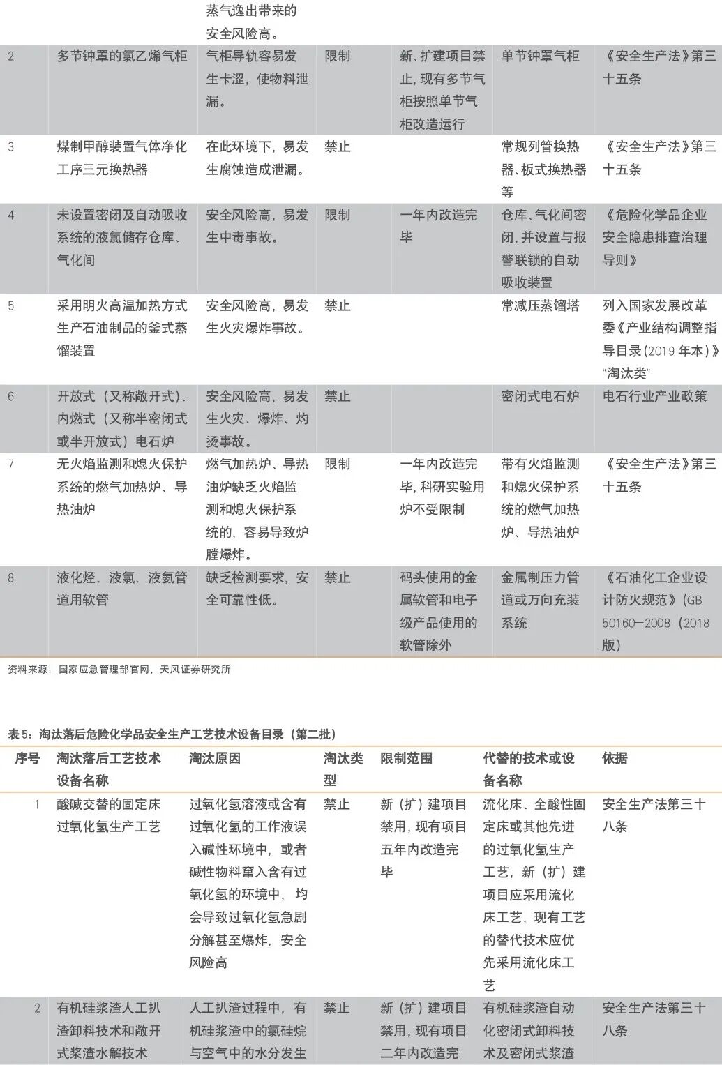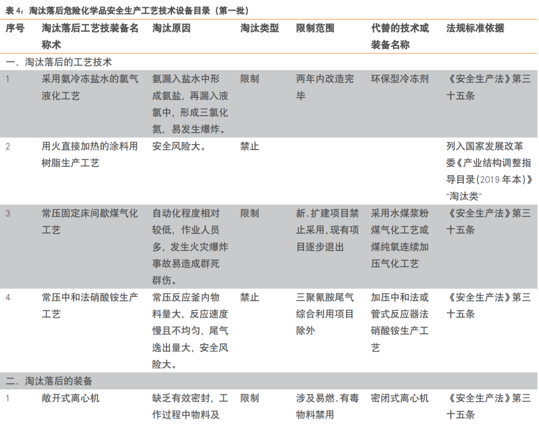 安全评估方面:对照相关政策文件及标准规范,评估涉及“两重点一重大(重点监管危险化学品、重点监管危险化工工艺和重大危险源)”老旧装置外部安全防护距离是否满足要求、是否存在落后危险化学品安全生产工艺技术设备。已纳入2024年6月份应急管理部、工业和信息化部、国务院国资委、市场监管总局联合印发的《化工老旧装置淘汰退出和更新改造工作方案》的对象范围,不再开展安全风险评估,原淘汰退出和更新改造工作计划和要求不变,对未列入淘汰计划的,需开展其他评估、填报装置相关信息。其他评估方面:对照相关政策文件及标准规范,评估装置(工艺技术、设备、产品)是否符合产业政策要求,外部环境防护距离、污染物排放、能效、能耗等是否符合相关要求。《行动方案》要求:“实施老旧石化化工装置标准提升专项行动,聚焦安全提升、绿色转型、数智改造、性能升级等方向,建立覆盖老旧装置更新改造各项要求和各个环节的标准体系,全面支撑和引领老旧石化化工装置更新改造工作。”我们认为下文附件2中针对老旧装置的评估标准,有望在未来的专项行动中逐步更新,实现标准的逐步抬升。
