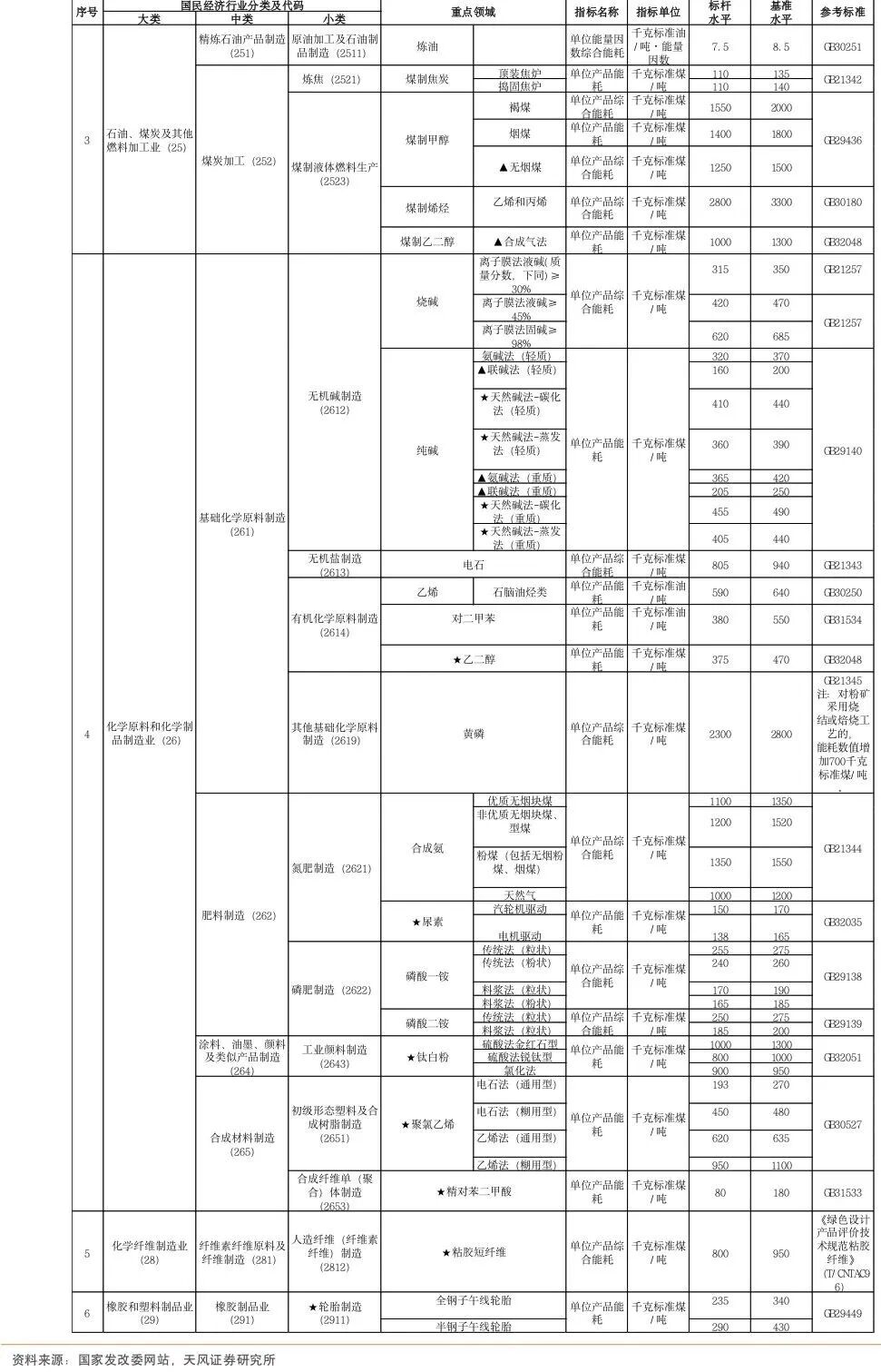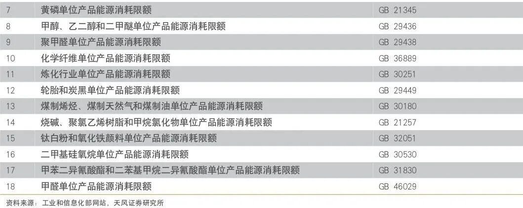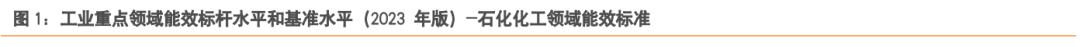 2023年06月06日,国家发改委等部门发布《工业重点领域能效标杆水平和基准水平(2023年版)》。根据《能效水平2023年版》分类,能效标准覆盖36个大类,其中炼油、煤制焦炭、煤制甲醇、煤制烯烃、煤制乙二醇、烧碱、纯碱、电石、乙烯、对二甲苯、黄磷、合成氨、磷酸一铵、磷酸二铵、水泥熟料、平板玻璃、建筑陶瓷、卫生陶瓷、炼铁、炼钢、铁合金冶炼、铜冶炼、铅冶炼、锌冶炼、电解铝等25个重点领域在《能效水平2021年版》中已经提出,并在2023年版中增加了乙二醇,尿素,钛白粉,聚氯乙烯,精对苯二甲酸,子午线轮胎,工业硅,卫生纸原纸、纸巾原纸,棉、化纤及混纺机织物,针织物、纱线,粘胶短纤维等11个领域。