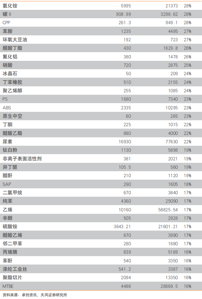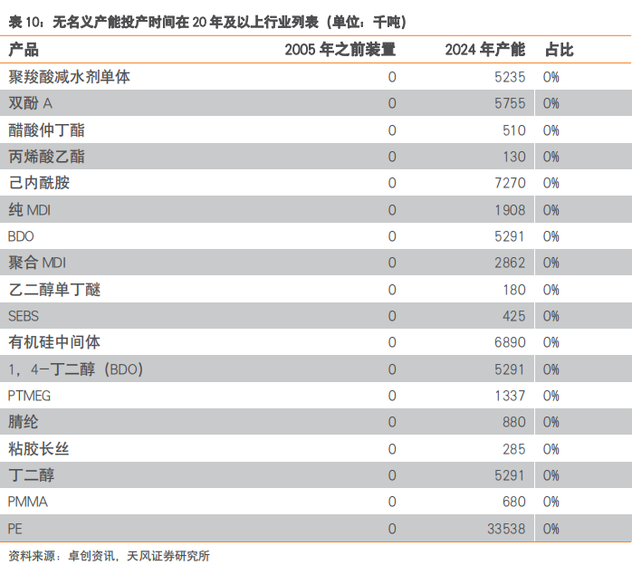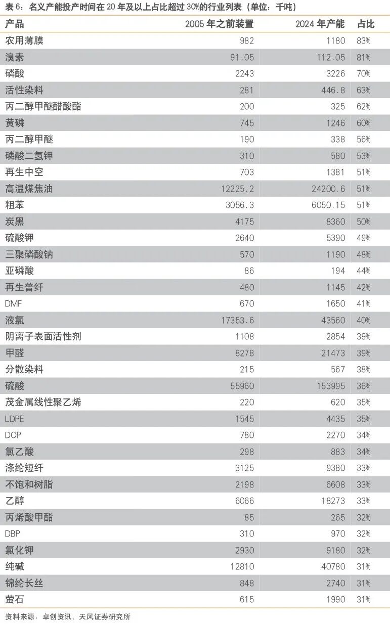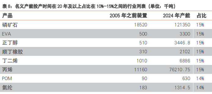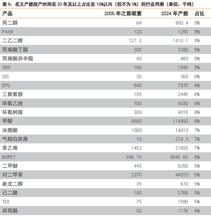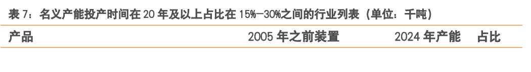 我们在2025年07月23日发布的《老旧设备更新改造,供需两端发力的“成本要素”》报告中,根据卓创资讯数据,针对149个子行业产能装置投放时间进行统计,得到以下五张表(统计按照2005年为界,2024年总产能作为基数)。4.1.外部因素影响下,政策执行不达预期