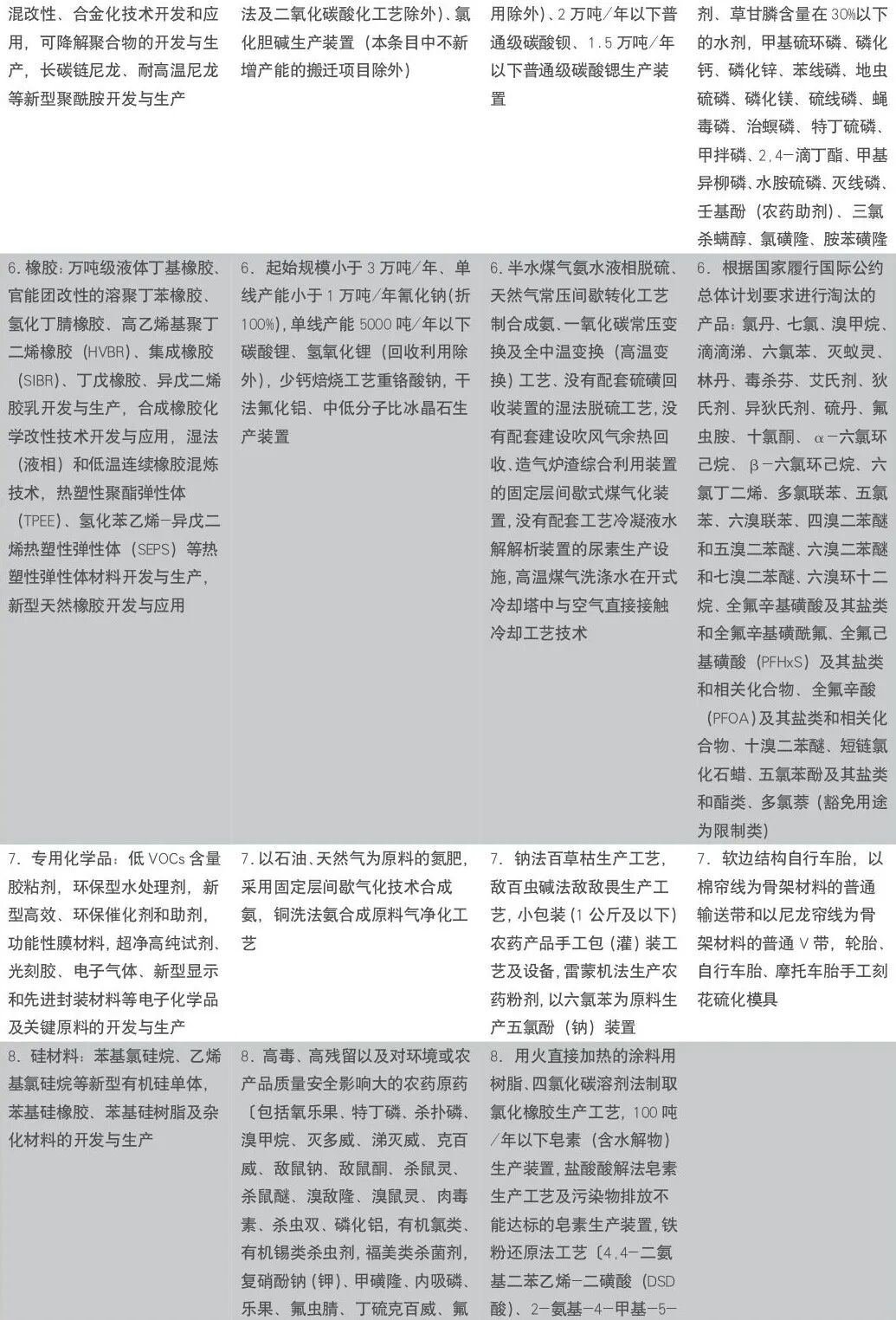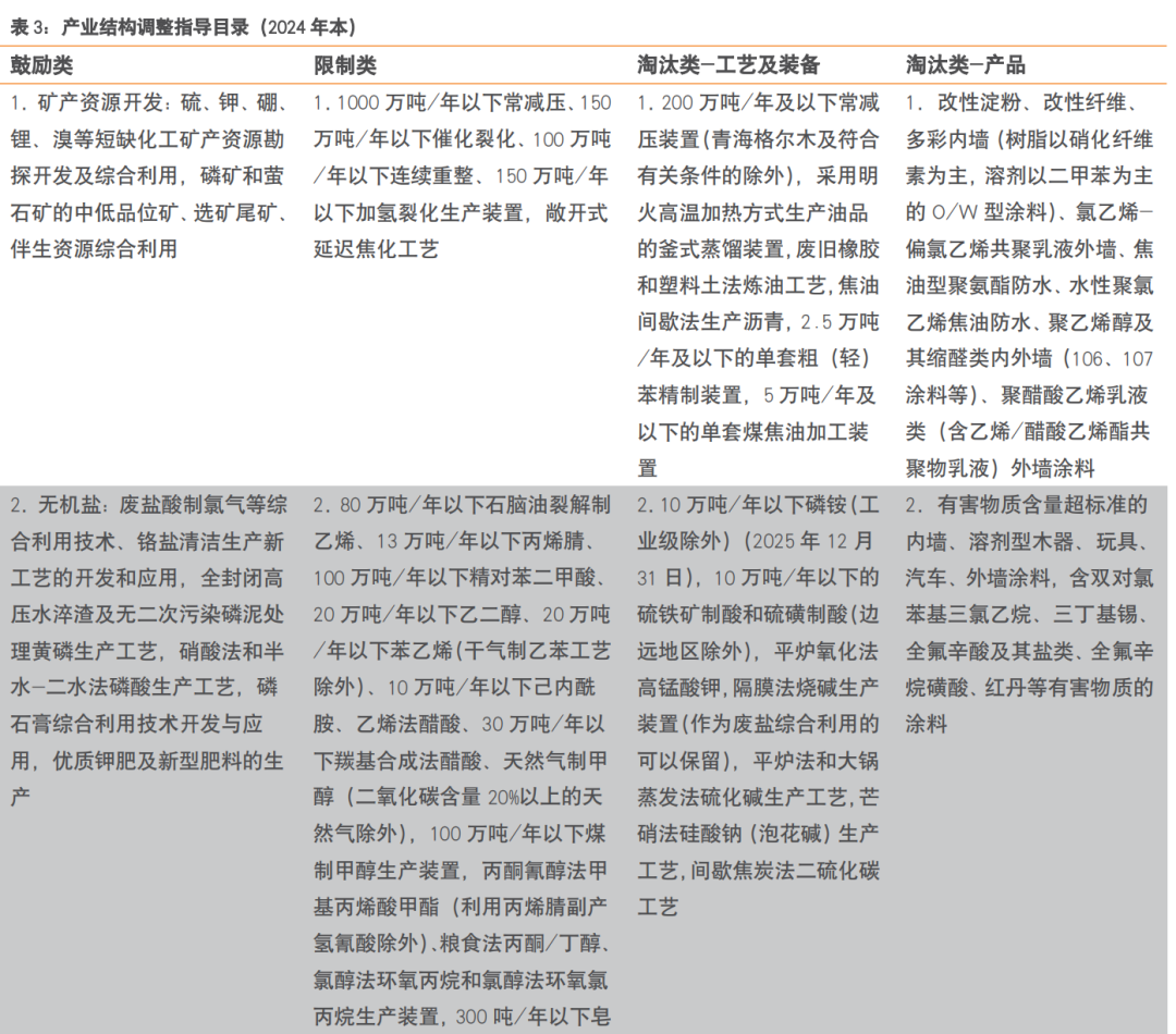 《行动方案》附件2,产业政策类标准,参考《产业结构调整指导目录》。《产业结构调整指导目录(2024年本)》已经2023年12月1日第6次委务会议审议通过,自2024年2月1日起施行。下列表3为在《产业结构调整指导目录》所列的石化化工类产品。