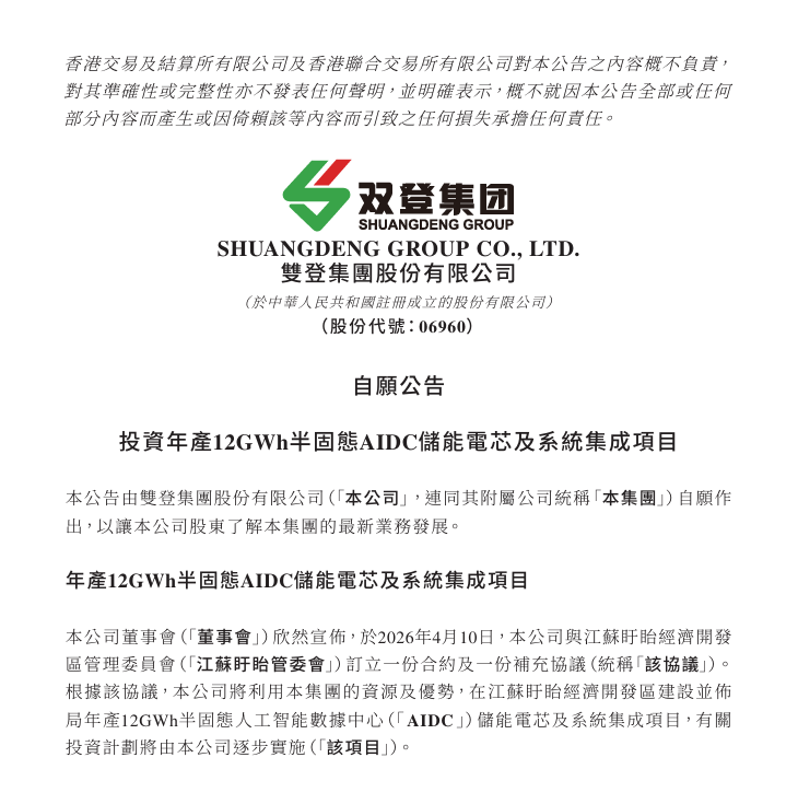4月10日,双登股份发布公告,公司与江苏盱眙经济开发区管理委员会签订了一份合同及一份补充协议,计划投资建设年产12GWh半固态人工智能数据中心(AIDC)储能电芯及系统集成项目。