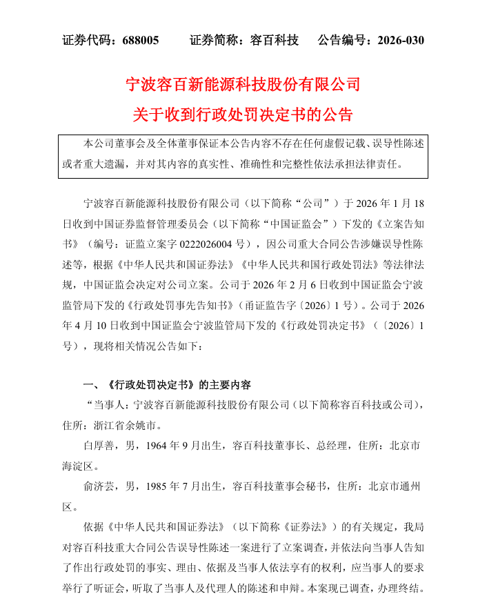 4月10日,宁波容百新能源科技股份有限公司发布公告,披露公司收到中国证监会宁波监管局下发的《行政处罚决定书》。经查明,公司及董事长白厚善、董事会秘书俞济芸未能保证信息披露真实、准确、完整,被给予警告,并分别处以450万元、300万元、200万元罚款,合计罚款950万元。