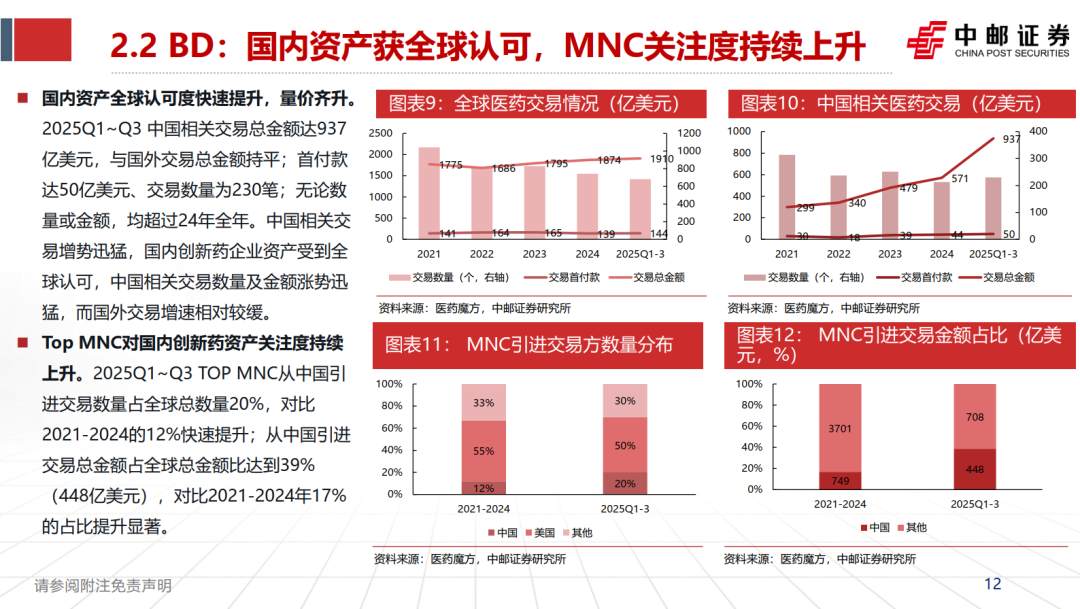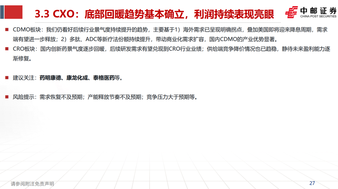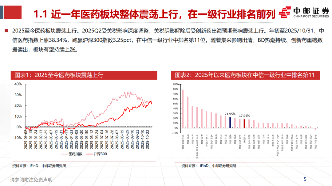 2025至今医药板块震荡上行。 2025Q2受关税影响深度调整,关税阴影解除后受创新药出海预期影响震荡上行。医药板块估值溢价率为268.64%,达到历史74.00%分位,高于历史平均溢价率237.04%,处于2010年以来的相对中位, Q3有所回落。 25Q3医药主题基金规模创新高,各板块行业龙头地位稳固。行业数据方面,我国基本医保基金收支稳健增长,在医药支付端提供稳定支撑。国内创新药资产全球认可度快速提升, BD交易量价齐升, Top MNC对国内创新药资产关注度持续上升;器械招采增速较Q2高位有所回落,但整体仍处于稳健增长姿态。我们看好Q4及明年医药板块调整后的配置性价比,建议重视: 1.创新药: 看好创新药长期产业趋势。中国整体的创新药产业经过过往10余年的快速发展,具备参与全球竞争的实力。下半年以来,国内的BD出海交易虽有短暂真空,但仍在持续, Q4以来亦诞生了多个MNC为合作方的交易。我们认为,海外MNC的购买行为系对国内创新药公司创新研发的实力的背书认可。进一步看,我们认为系中国创新药产业链能力、管线数量和质量、研发效率在全球的强大竞争优势催生出的结果,坚定看好长期的产业趋势。受益标的: 信达生物、康方生物、科伦博泰生物、迈威生物、君实生物、维立志博、乐普生物、荃信生物、映恩生物等。 2.CXO&科研服务: 受益于海外降息周期来临以及国内创新药景气度回暖, CXO底部回暖趋势基本确立,利润持续表现亮眼,科研服务盈利能力显著提升。受益标的:药明康德、康龙化成、奥浦迈、百普赛斯等。 3.化学制剂: 看好研发思路明确、资金利用效率高的企业,重点关注研发思路和执行效率,受益标的:恒瑞医药、科伦药业、海思科、奥赛康、京新药业、苑东生物、汇宇制药等。 4. 生物制品: 主要关注产品放量、在研管线数据或BD预期引发的估值重估机会。受益标的:天坛生物、欧林生物、神州细胞、安科生物、我武生物、甘李药业等。 5.医疗器械: 随着反腐边际改善,集采反内卷和设备采购资金逐步落地,医疗器械板块拐点初现,受益标的: 惠泰医疗、微电生理、迈普医学、山外山、奕瑞科技、心脉医疗、南微医学、安杰思、迈瑞医疗、开立医疗、澳华内镜。 6.医疗服务: 看好持续扩张及优质资产注入下市占率提升以及消费复苏下弹性较大的眼科、口腔行业。受益标的:爱尔眼科、固生堂。 7.中药: 业绩阶段性承压,看好集采/基药政策受益、创新驱动、高基数出清方向,受益标的:佐力药业、方盛制药、众生药业、康缘药业、天士力、贵州百灵、九芝堂、桂林三金、以岭药业、贵州三力。 8.医药商业: 看好龙头药房凭借其专业化的服务能力、强大的供应链体系、数字化精细化的管理以及内控合规体系在行业整合阶段强者恒强。受益标的:益丰药房、大参林。风险提示: 行业竞争加剧风险、集采降价超预期风险、企业外延并购落地低于预期风险、国际地缘政治风险、关税扰动风险。