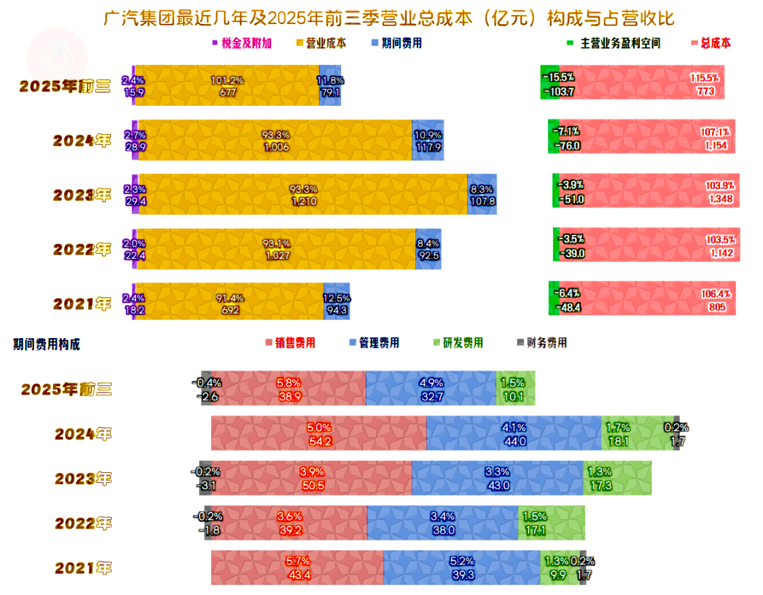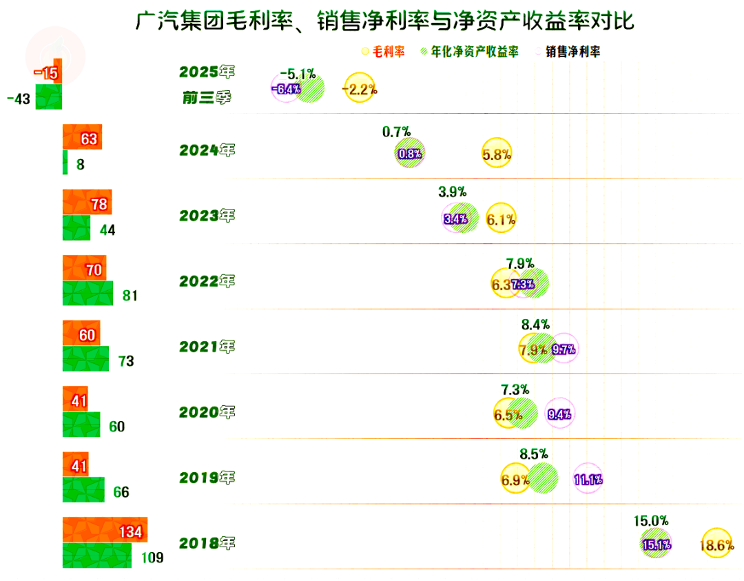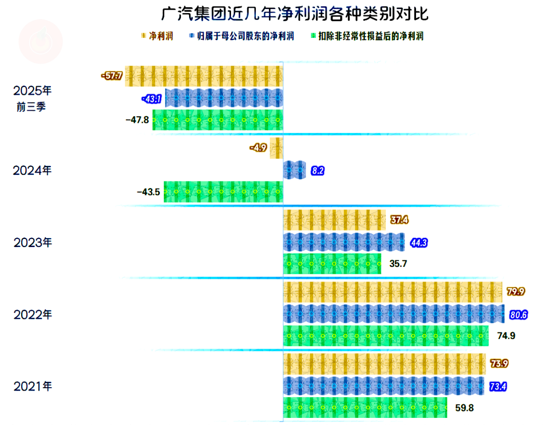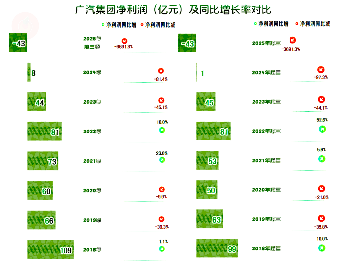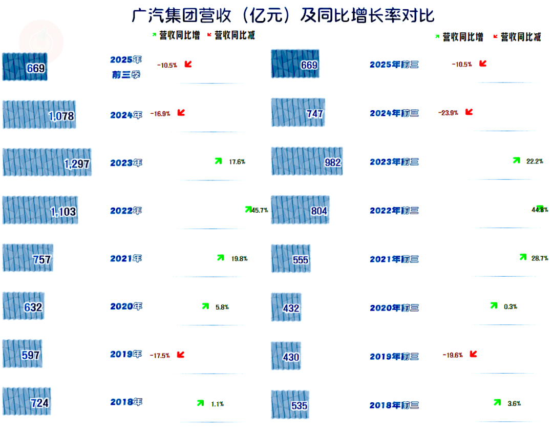 2025年前三季度,广汽集团的营收下跌了10.5%,较2024年同期和全年,跌幅都有所收窄,但并未止跌反弹,显然不能说情况已经好转了。