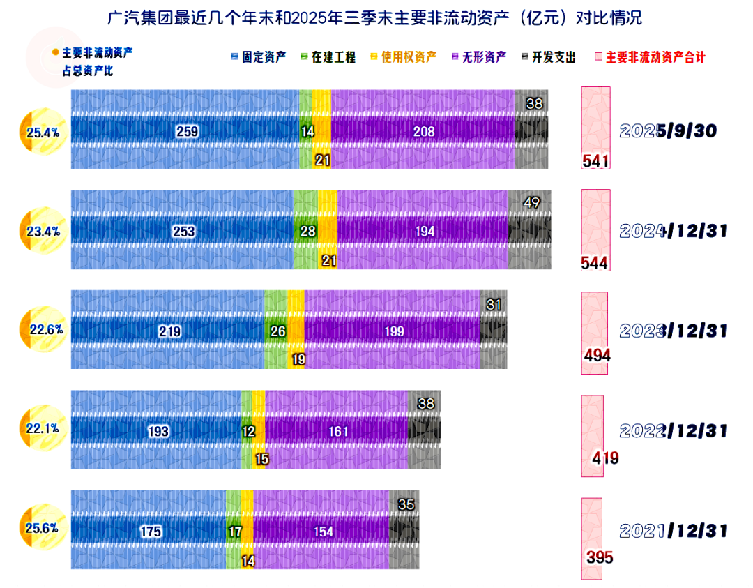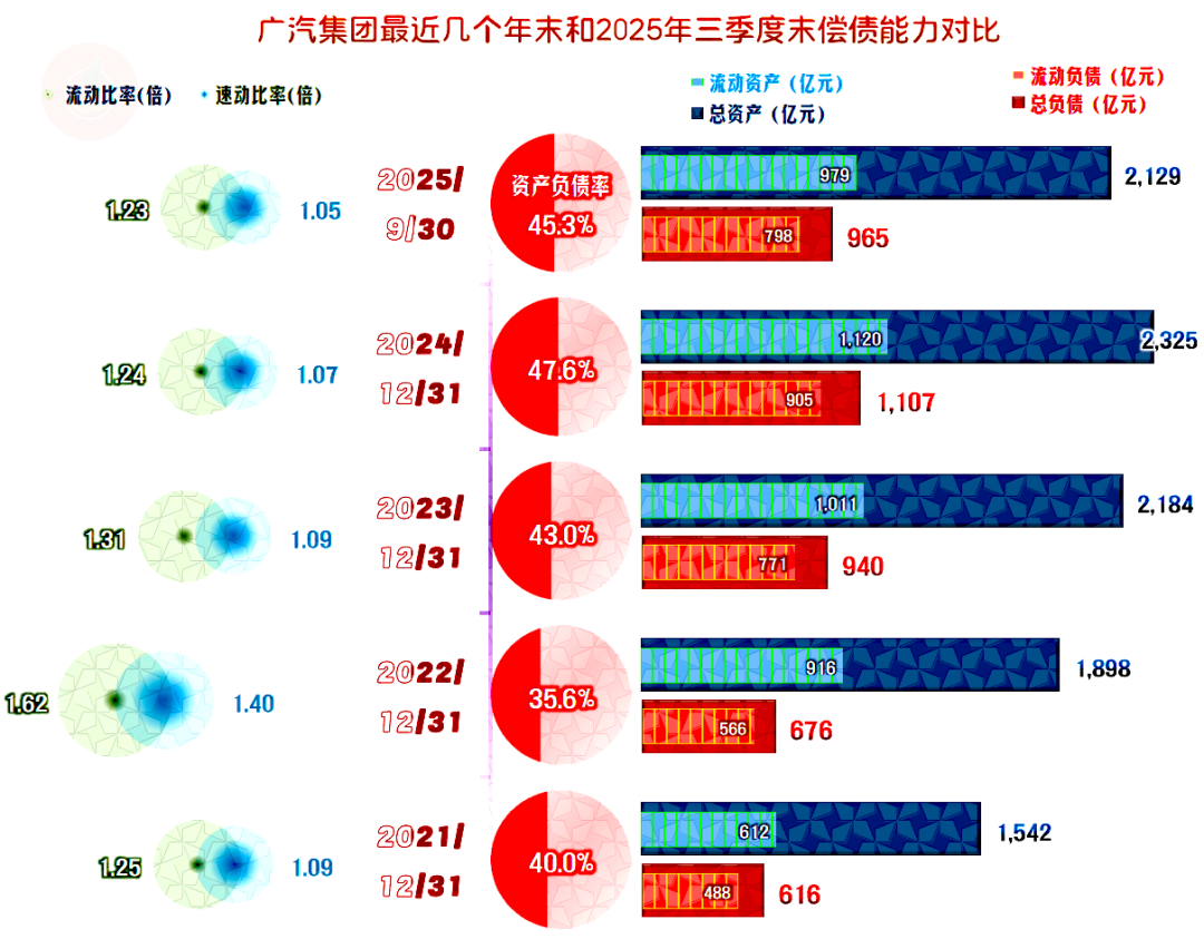 广汽集团的长短期偿债能力都是相当强的,由于合营企业的效益下降是近几年的事,还有以前相当长一段时间,传祺等品牌也相当热销,暂时的困难也就是近几年的事。2025年三季度末,出现了明显“缩表”(总资产下降)的迹象,这当然是理性的选择,确实不需要与市场表现逆着来搞产能布局。