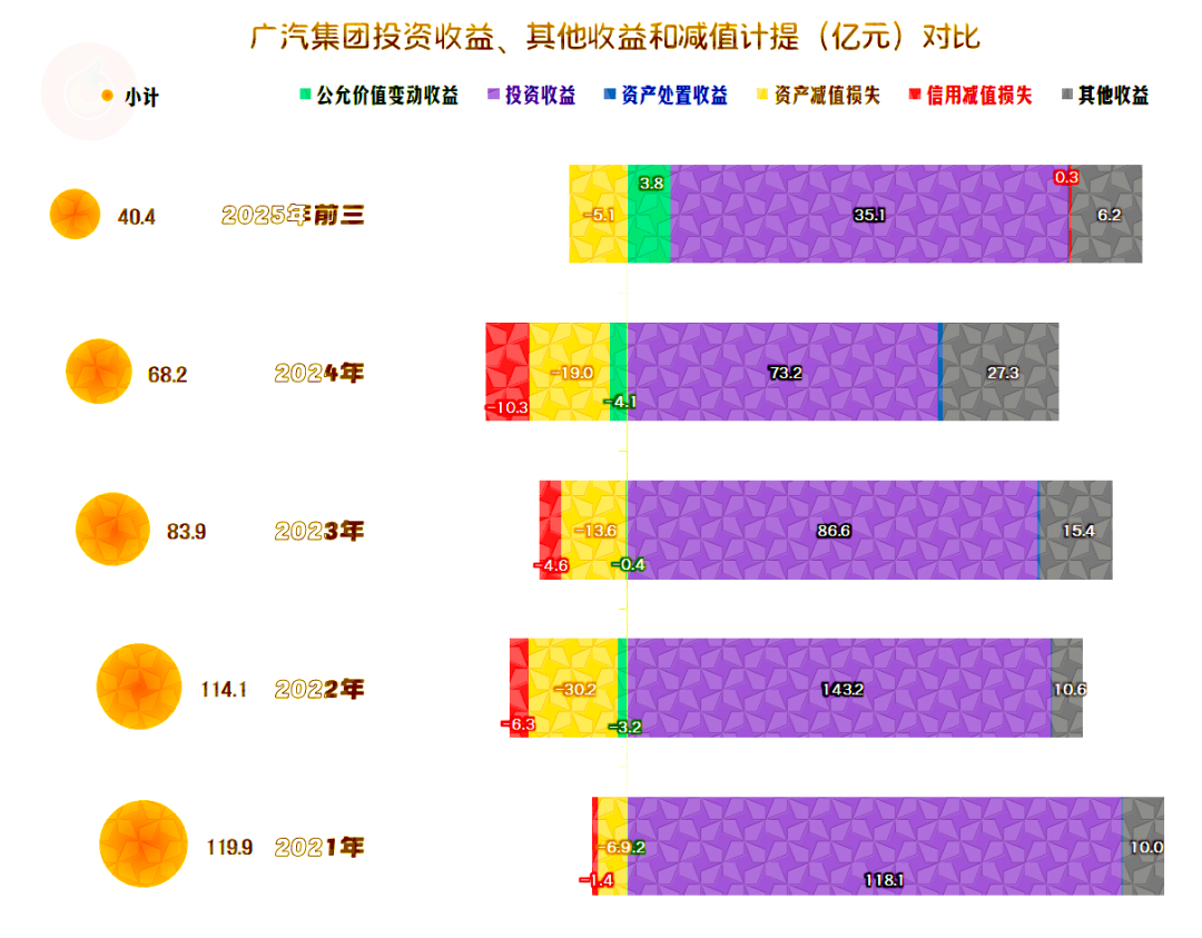 在其他收益方面,也是逐年下滑的趋势,虽然也有政府补助和两大减值损失的影响,但关键的构成因素还是投资收益,主要就是几家大型合营企业的收益。而投资收益方面,在2022年创下143.2亿元的峰值后,持续下跌,两年就跌去一半;从2025年前三季度的水平看,2025年全年的下跌幅度,应该也不会低。