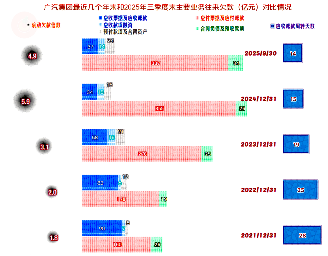 “应付票据及应付账款”在2024年末达到了355亿元的峰值,2025年上半年就遇到了汽车行业的“60天账期”事件,三季度末的余额较年初略有下降。广汽集团上半年的营业成本在480亿元以上,扣除不需要采购的工资等部分,其平均账期似乎是能达标的。但由于供应商的实力等情况不同,部分供应商回款周期高于60天,也是有可能的。