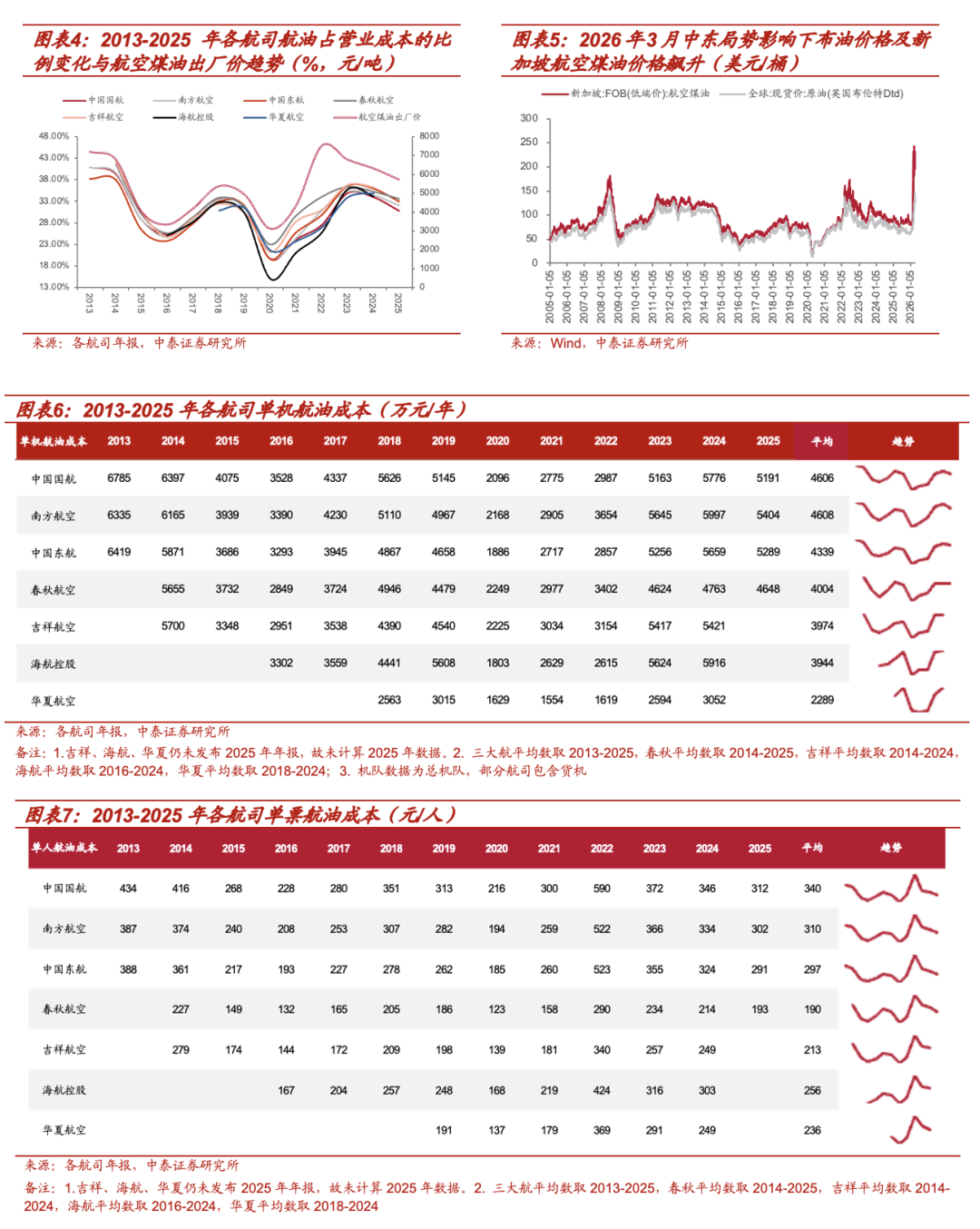 从单机航油成本看,三大航较高,春秋航空、华夏航空维持低位。三大航由于宽体机数量多、国际航线占比高等原因,单机航油成本相对较高,春秋航空(单一机型、单一舱位、高客座率)、华夏航空(支线飞机为主,航程短)单机航油成本维持稳定低位。从2013-2025年的平均数看(仅包含各航司已有数据),春秋航空、华夏航空平均单机航油成本分别为4004/2289万元/年,国航/南航/东航/吉祥/海航/华夏的平均单机航油成本分别为4606/4608/4339/3974/3944万元/年,吉祥航空由于2018年开始引进宽体机,单机航油成本增高。2025年国航/南航/东航/春秋的单机航油成本在5191/5404/5289/4648万元/年。