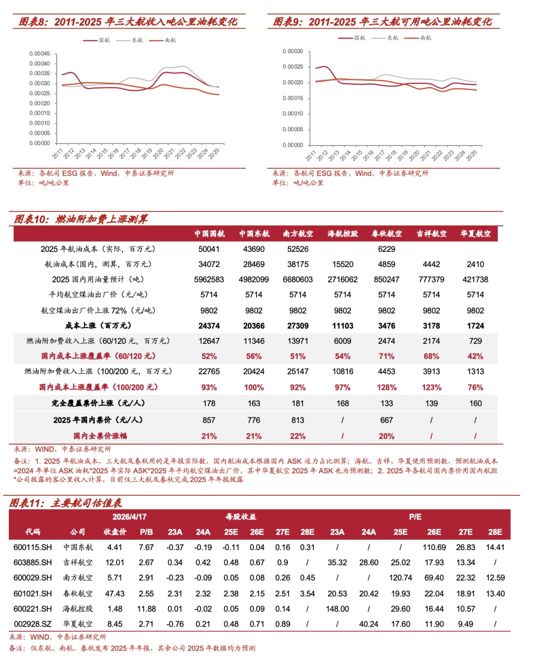 从吨公里油耗看,三大航2010-2025年来(剔除异常年份),收入吨公里油耗及可用吨公里油耗呈下降趋势,南方航空指标双重领先。2025年国航/东航/南航单位收入吨公里油耗分别为0.0002835/0.0002818/0.0002456吨/吨公里;单位可用吨公里油耗为0.0001943/0.0002034/0.0001773吨/吨公里。从数据上看,三大航中南航的燃油效率相对较高。