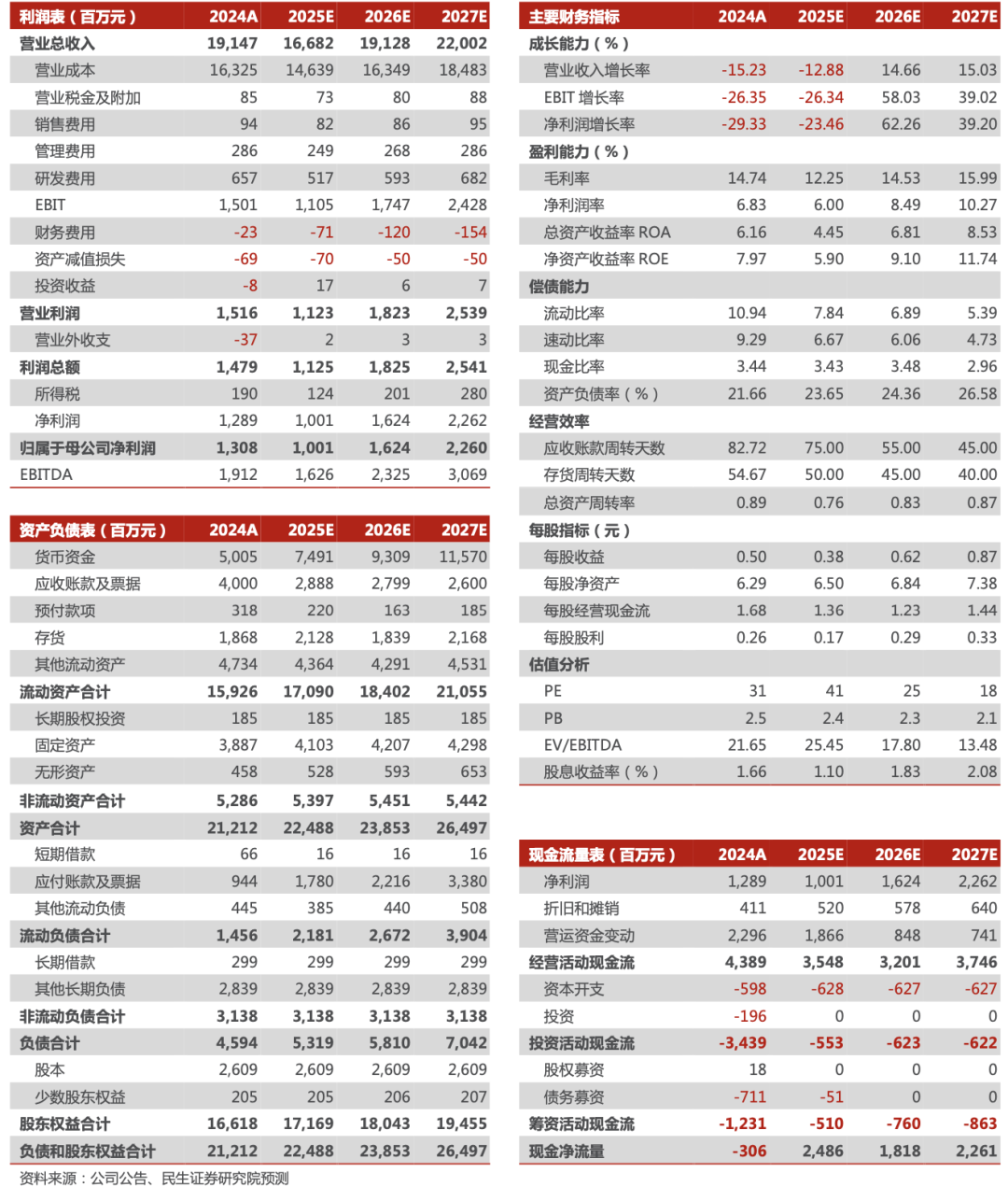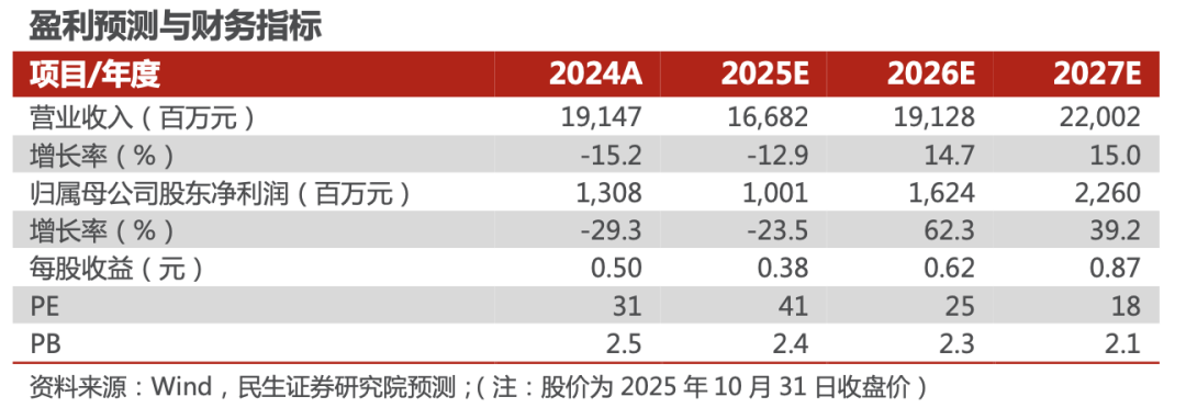 我们预计公司2025-2027年营收分别为166.82、191.28、220.02亿元,对应增速分别为-12.9%、14.7%、15.0%;归母净利润分别为10.01、16.24、22.60亿元,对应增速分别为-23.5%、62.3%、39.2%,以10月31日收盘价为基准,对应2025-2027年PE为41X、25X、18X,公司是光伏胶膜的龙头企业,有望平稳穿越周期,维持“推荐”评级。