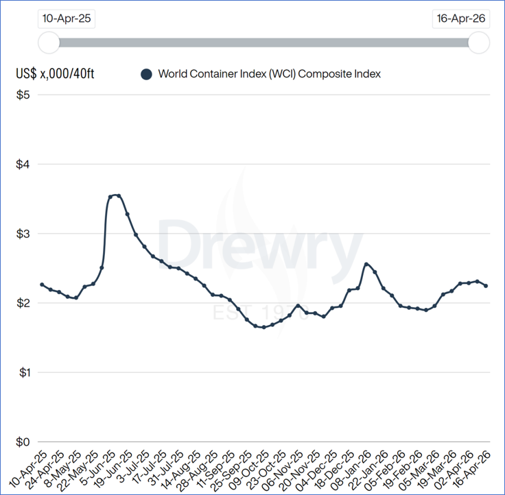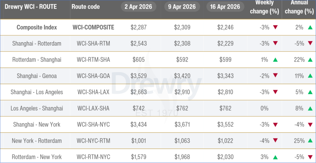 截至4月16日,Drewry世界集装箱运价指数(WCI)下跌3%至2246美元/FEU。