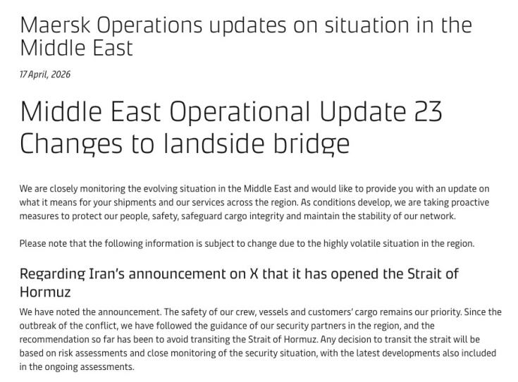 马士基明确表示:马士基注意到了伊朗关于霍尔木兹海峡“开放”的声明。船员、船舶和客户货物的安全仍然是马士基的首要任务。自冲突爆发以来,马士基遵循了该地区安全伙伴的指导,截至目前的建议是避免通过霍尔木兹海峡。任何通过海峡的决定都将基于风险评估和对安全局势的密切监测,最新进展也将纳入正在进行的评估中。