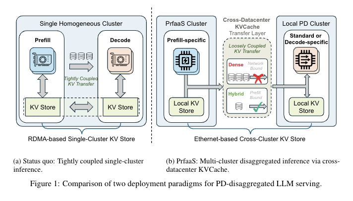 它是一种跨数据中心的大模型推理服务架构,核心是将长上下文请求的Prefill计算,选择性卸载到独立的、算力密集型的专用集群完成,再把生成的KV Cache通过普通以太网传输到本地PD集群执行Decode。