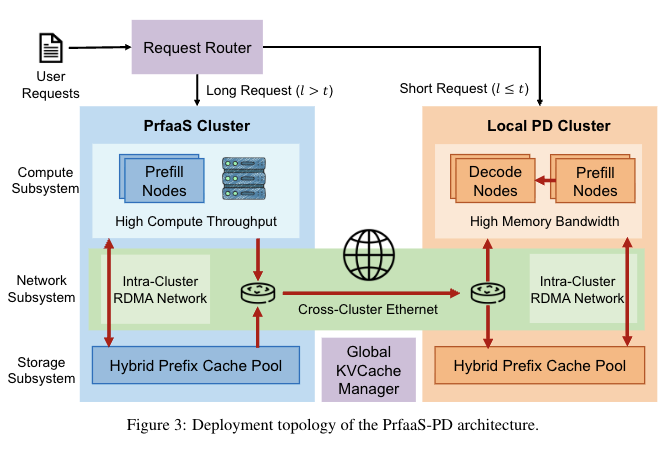 只有长请求(未缓存长度 > t)才会被送到专门的PrFaaS集群做Prefill,生成的KV Cache再通过以太网传回本地做 Decode。