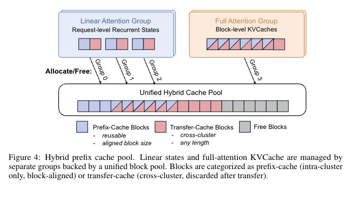 团队设计了一个混合前缀缓存池,把KV Cache分成两类。