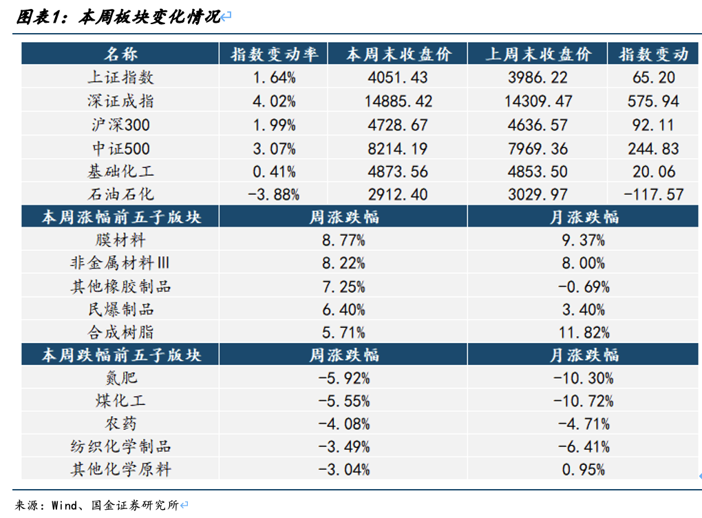 本周沪深300指数上涨1.99%,SW化工指数上涨0.41%。涨幅最大的三个子行业分别为膜材料(8.77%)、非金属材料Ⅲ(8.22%)、其他橡胶制品(7.25%);跌幅最大的三个子行业分别为氮肥(-5.92%)、煤化工(-5.55%)、农药(-4.08%)。