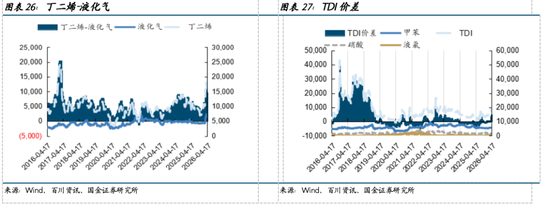 本周化工产品价差上涨前五位为ABS价差(159.07%)、合成氨价差(69.23%)、顺丁橡胶-丁二烯(32.1%)、乙烯-石脑油(20.98%)、PET价差(13.3%);价差下跌前五位为聚丙烯-丙烯(-146.9%)、DAP价差(-77.34%)、PTA-PX(-20.45%)、丁二烯-液化气(-10.62%)、TDI价差(-10.37%)。