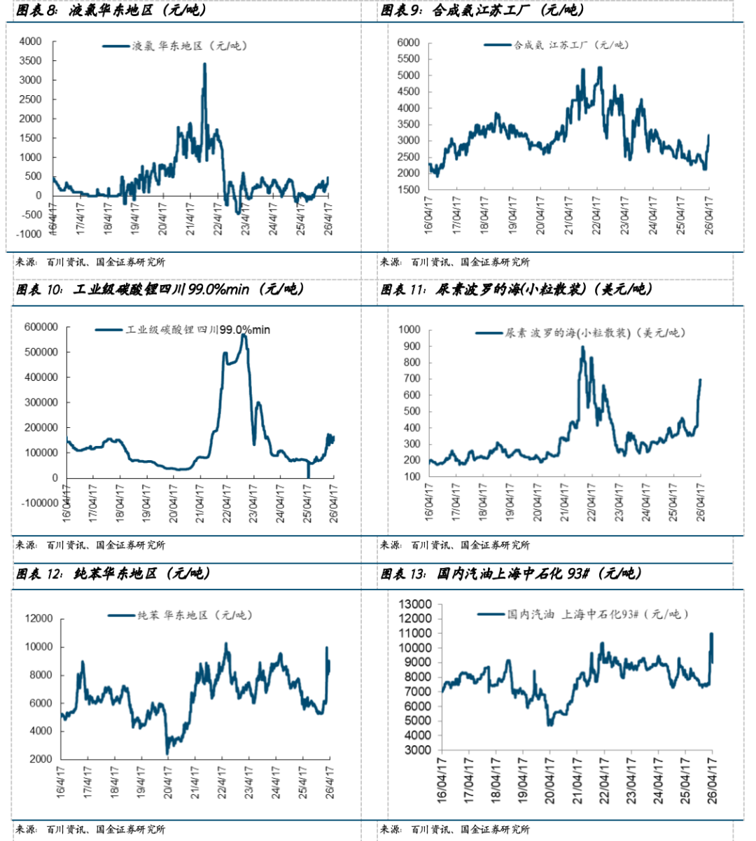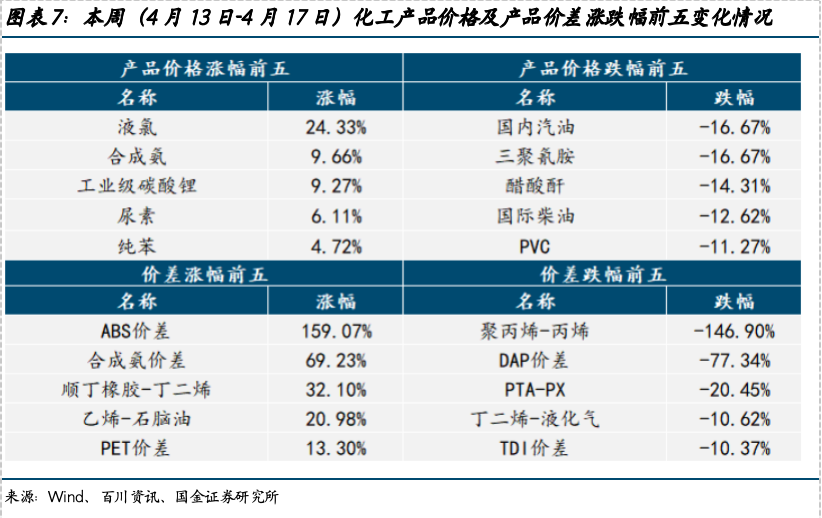 本周化工产品价格上涨前五位为液氯(24.33%)、合成氨(9.66%)、工业级碳酸锂(9.27%)、尿素(6.11%)、纯苯(4.72%);价格下跌前五位为国内汽油(-16.67%)、三聚氰胺(-16.67%)、醋酸酐(-14.31%)、国际柴油(-12.62%)、PVC(-11.27%)。