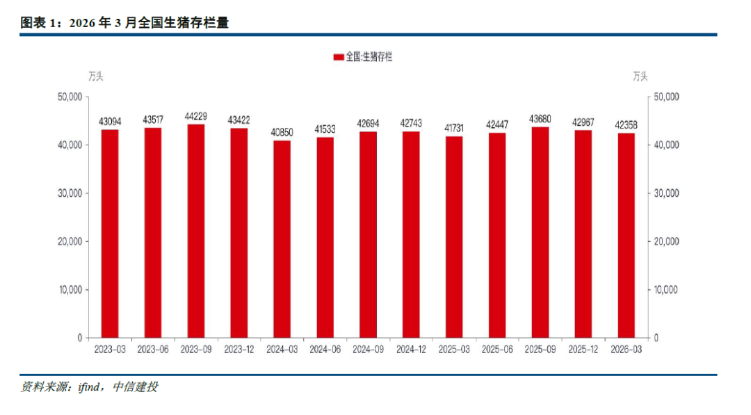 根据统计局4月17日发布的数据,2026年3月底,全国生猪存栏42358万头,同比增加627万头,增长1.5%,环比25年末下降609万头。存栏数据开始逐步下行。