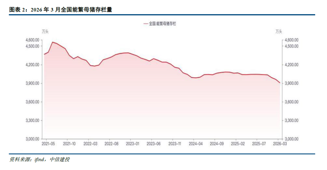 根据2026年3月农业农村部在产能调控专题会议,要将能繁母猪合理保有量目标进一步从3900万头下调至3650万头,累计调减幅度超过11%。未来能繁母猪的去化将是监管和市场共同关注的核心指标。