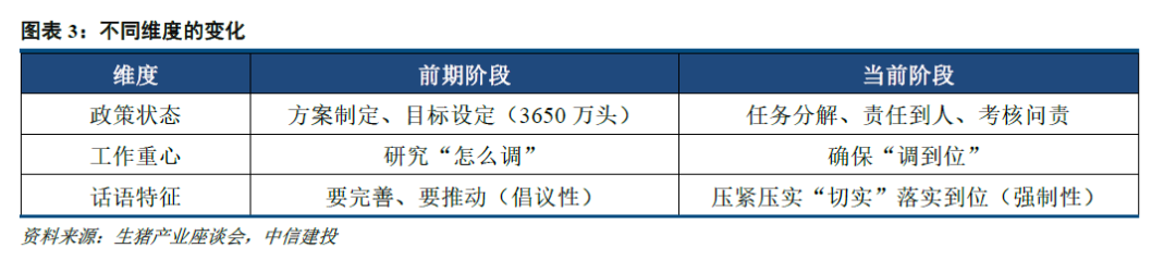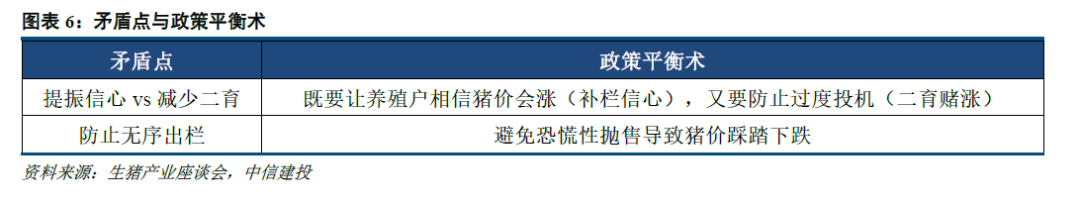 “头部企业要带头落实产能去化要求,并结合环境保护、资产负债等约束盲目扩产。”头部养猪企业要承担带头作用,同时结合会议纪要中强调压实责任以及严控新增产能的表述,预计后续监管对于龙头企业的经营数据会非常重视,此外关于“环境保护和资产负债”等关键词表述,也体现出了对于企业的约束手段。“同向发力”是关键:过去环保、产能、金融政策可能各自为政,现在形成组合拳,从土地、资金、环保三方面卡住扩产路径。
