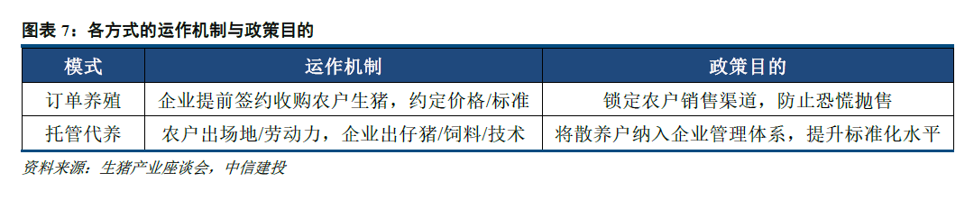 “要引导龙头企业通过订单养殖、托管代养等方式,带动合作农户发展标准化规模化养殖,支持中小养殖场户提升发展能力。”政策意图:集团场养殖效率高,是竞争优势的一方,从纯效率角度是需要支持的。但是中国仍有许多生猪由年出栏500头以下中小户提供,完全淘汰不现实,需要考虑就业与民生问题。通过“企业 农户”模式,既保留中小户就业功能,又实现整体的高效发展。