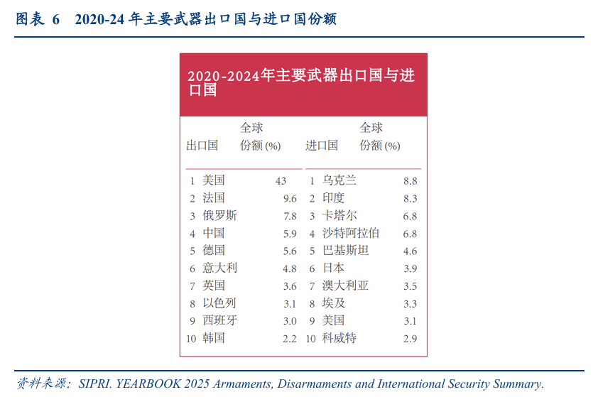 2025年7月我们在深度报告《航天南湖:防空预警雷达或受益于新质战斗力与军贸东风起,关注低空布局——华创交运低空60系列研究(二十)》中,引用斯德哥尔摩国际和平研究所(SIPRI)2025年鉴数据:
