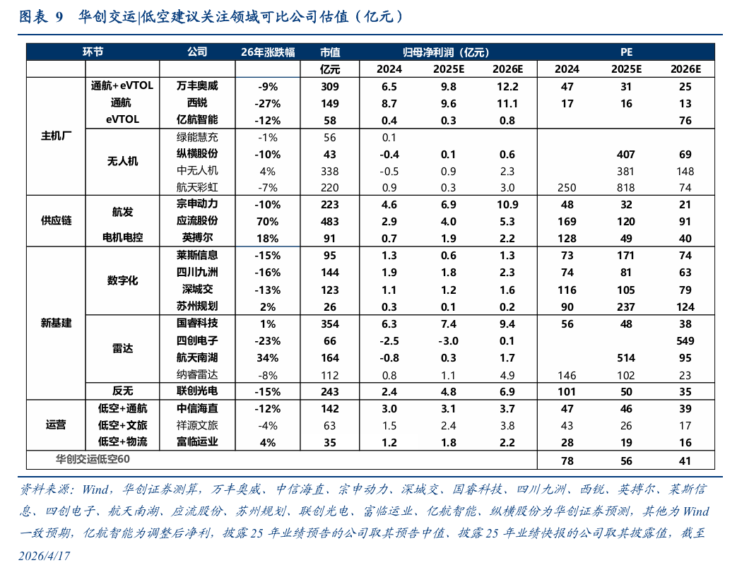 我们认为:低空经济被列为“十五五”期间六大新兴支柱产业, 2026年低空经济或步入建设提速年,持续建议围绕“四大应用场景 两大新基建 五大产业链环节”布局投资机会。