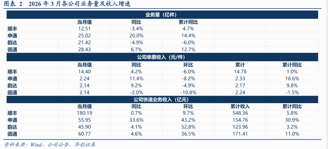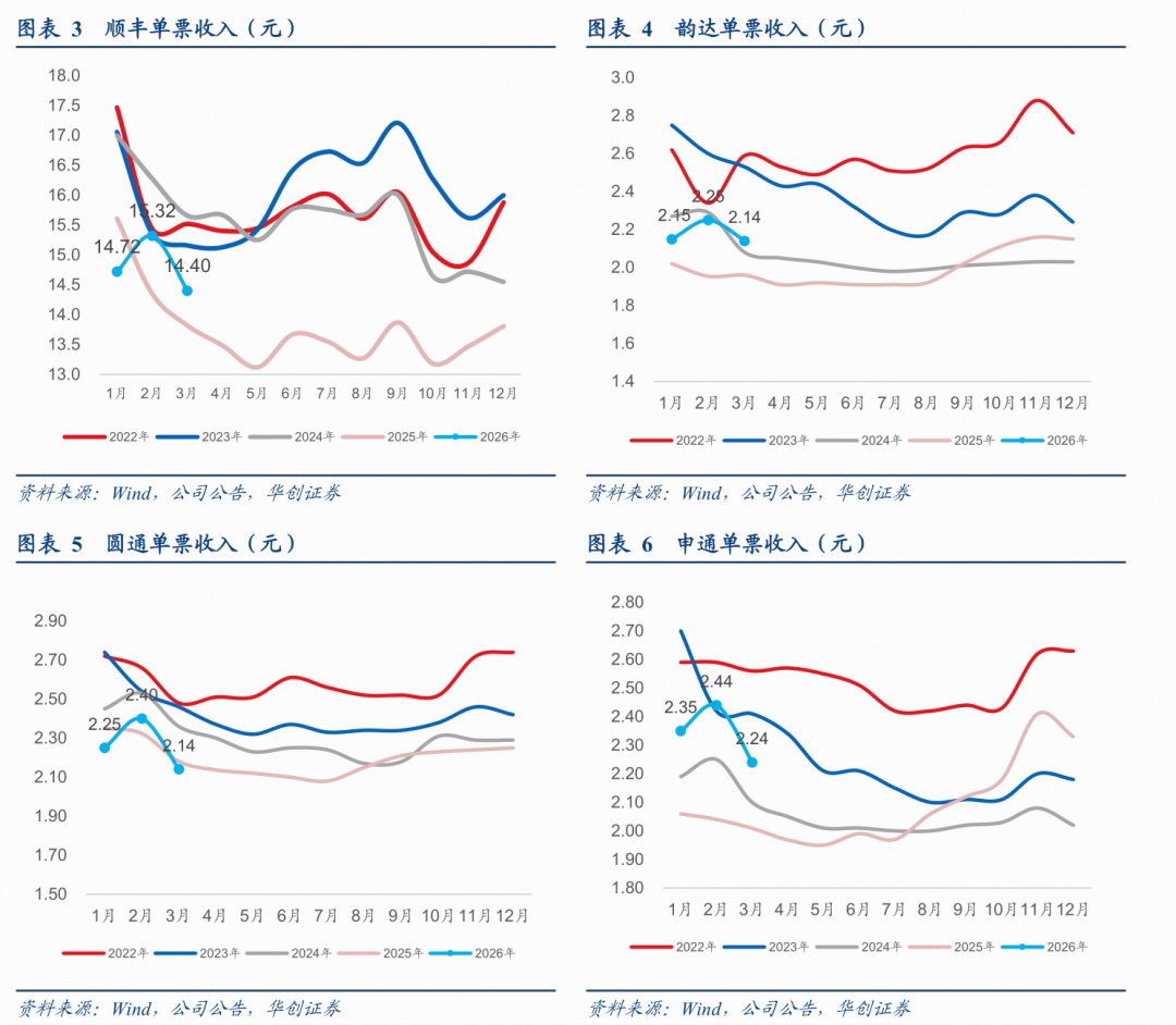 1)总量看:公司2025年以来推进“激活经营”机制,业务量实现较高增速,推动网络产能提升及模式优化。为进一步优化业务结构,公司于2025年第三季度推出“激活经营”进阶机制,由规模驱动进阶为价值驱动,逐步动态调优市场策略,保障业务高质量增长。得益于经营策略有效落实,25Q4公司毛利率回升至14.28%、26年3月顺丰中高端时效业务收入保持稳健增长,速运物流业务单票收入实现同比回升。我们建议继续关注公司“增益计划”调优结构。