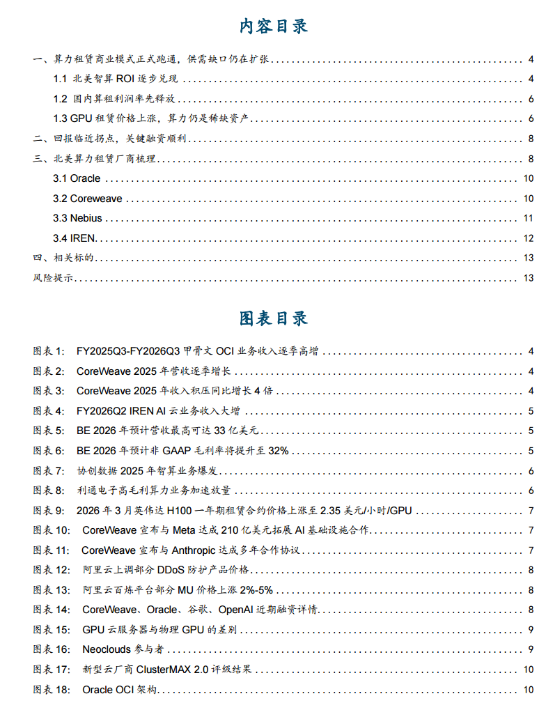 海内外头部算力租赁厂商ROI逐步兑现。1)头部算租厂商营收与订单双爆发:海内外算力租赁厂商ROI逐步兑现,甲骨文FY26Q3的OCI业务收入同比高增84%; CoreWeave 2025Q4营收达15.72亿美元( 110%),收入积压高达668亿美元 ;国内如协创数据、利通电子等厂商利润弹性也已加速释放。2)需求侧巨头长约锁定供给:Meta与CoreWeave签署了总额高达352亿美元的算力供应合同,Anthropic也签署了多年期协议锁定英伟达GPU算力。3)供给瓶颈驱动价格持续上行:英伟达H100的一年期租赁合约价格已由2025年10月的低点约1.70美元/小时/GPU,上涨至2026年3月的2.35美元/小时/GPU,涨幅近40%,2026年8-9月前上线的新一代Blackwell系列产能已被全部预订,算力仍是当前的稀缺资产。