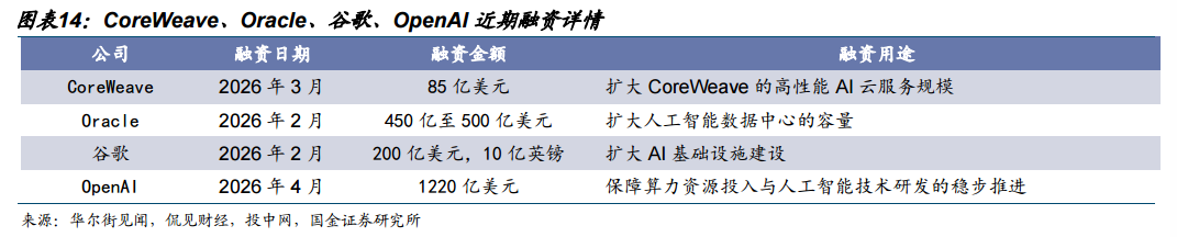 回报临近拐点,关键融资顺利。近期,CoreWeave完成85亿美元融资,成为全球首个获得投资级评级的高性能计算(HPC)基础设施融资工具,标志着GPU支撑的数据中心资产正式获得了主流机构信贷市场的认可 。据估算,GPU资产可在2.5年内完全收回成本,后续将产生纯现金流支撑长期盈利 。与此同时,OpenAI完成高达1220亿美元的单笔私募融资,甲骨文与谷歌也分别启动了规模近500亿美元和超200亿美元的巨额融资计划以加速扩建AI数据中心 。大规模且低成本的资本注入,为整个行业跨越重资产扩张瓶颈提供了坚实底座。