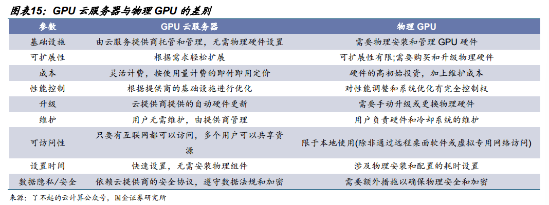GPU云以按需租用模式提供高性能算力,正成为AI时代的关键基础设施。GPU云亦被称为“新兴云厂商”,即Neoclouds,是指厂商通过构建规模化GPU算力集群,将算力资源虚拟化后,以按需租用、按量计费的方式通过云端向用户提供计算服务的模式,广泛应用于人工智能训练与推理、高性能计算、影视渲染、科学研究等场景。GPU云服务器通过其强大的快速处理海量数据的计算性能,可以有效解放用户的计算压力。GPU云服务的核心竞争力由算力性能、软硬件适配性、服务灵活性、生态完整性四大要素构成。
