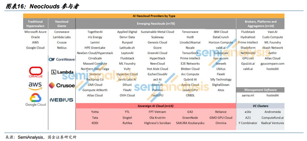 Neoclouds市场呈现多元化格局。根据SemiAnalysis ,Neoclouds市场参与主体划分为四类:一是传统超大规模云厂商(Traditional Hyperscalers),依托全球公有云基础设施提供GPU算力服务;二是新兴云巨头(Neocloud Giants),以专业化GPU云服务为核心业务的头部独立厂商;三是新兴云厂商(Emerging Neoclouds),数量众多、聚焦区域市场或细分场景的中小型GPU云服务商;四是经纪商、平台与聚合商(Brokers, Platforms and Aggregators),自身不直接持有GPU资源,主要提供算力撮合、资源整合与调度服务。