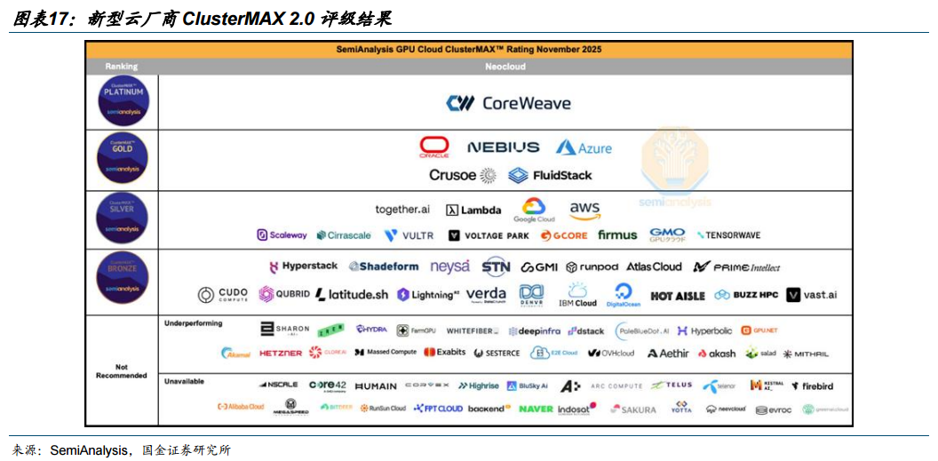 北美Neoclouds各厂商在十大维度和五项标准下呈现明显分级格局。SemiAnalysis的云服务厂商测试结果显示,基于安全性、生命周期、编排、存储、网络、可靠性、监控、定价、合作伙伴、可用性等十大维度,并结合Slurm、Kubernetes、独立主机、监控及健康检查五项预期标准进行评估后,新型云厂商被分为白金、黄金、白银、青铜、不推荐五级梯度。CoreWeave稳居榜首,是白金梯队中唯一的成员,它是唯一一家能够持续享有溢价定价权的云供应商。Nebius、Oracle 和Azure是黄金梯队中的头部供应商。Google跃升至白银梯队首位,与AWS、together.ai和Lambda并列。