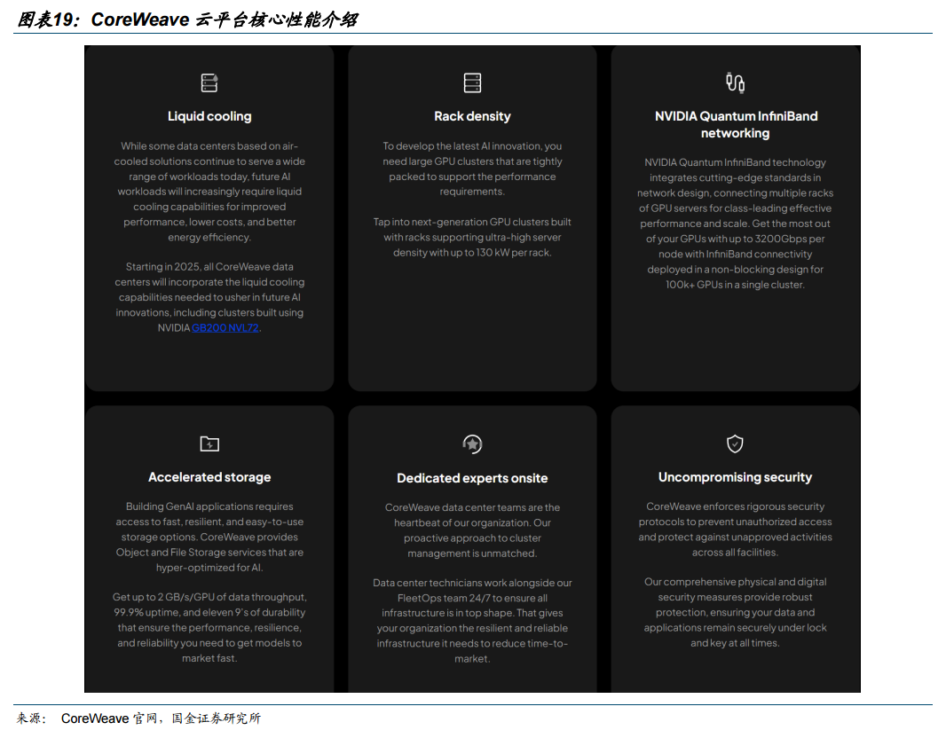 各梯队Neoclouds在服务形态与技术能力上差异显著。CoreWeave提供裸金属GPU服务器,支持SUNK、Kubernetes 与裸金属三种服务形态,依托 DPU 实现网络与安全卸载,具备完善的健康检查、高性能存储及机架级 SLA 保障。Nebius提供托管 Slurm-on-Kubernetes 服务,基于 KubeVirt 虚拟化部署,支持可抢占实例与自动扩缩容,具备节点自动修复及健康检查能力。Oracle采用批发裸金属模式,支持托管 Slurm与Kubernetes,提供GPU、RDMA 及高性能并行文件系统,具备节点自动修复与主动健康检查机制。Azure依托 AKS 实现节点自动修复,部署 InfiniBand 与 SHARP 互联,通过 CycleCloud 提供托管 Slurm 集群管理服务。白银梯队中Google Cloud、AWS、Lambda、together.ai可提供基础 GPU 云服务,满足常规算力需求,但在性能、稳定性与服务能力上较白金、黄金厂商存在明显差距。