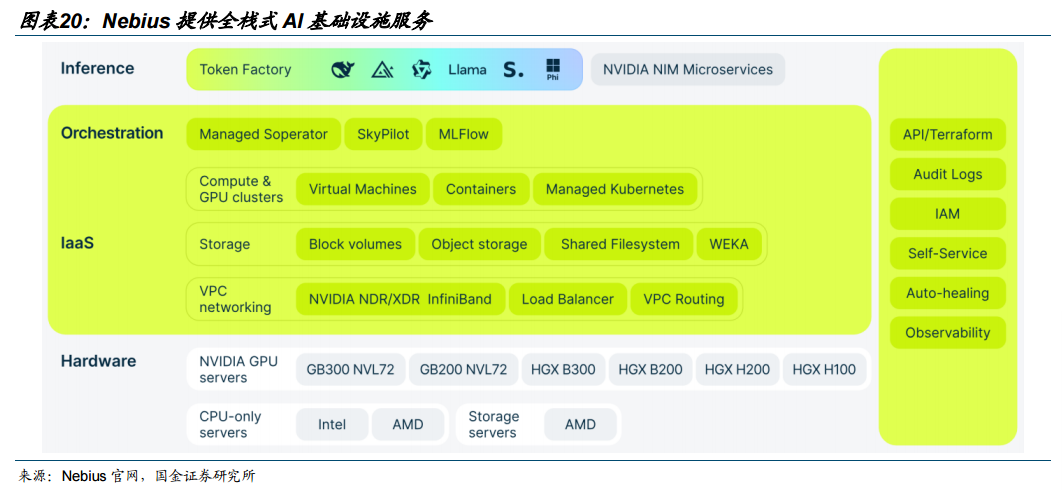 Nebius:快速崛起的全栈式AI基础设施提供商。Nebius以AI Cloud业务为核心,专注于为AI模型训练和ChatGPT等服务提供定制化算力基础设施,覆盖硬件、IaaS、AI平台与运维的全栈服务,具备交付端到端AI基础设施与解决方案的能力。1)与英伟达深度绑定:Nebius是英伟达的优先级合作伙伴、Reference Platform NVIDIA Cloud Partner的全球七家云服务提供商之一,能及时获得英伟达最新的技术和GPU供应,是市场上首批交付Blackwell产品的公司之一;2026年3月英伟达以可转债形式向Nebius投资约20亿美元,以支持其在2030年底前部署超过5GW的算力中心,双方将围绕人工智能算力平台展开深度工程合作。2)斩获多个大厂AI订单:2025年9月,Nebius与微软达成多年交易协议,基础合同金额为174亿美元,涵盖2025至2031年期间的GPU云计算服务,微软还可选择追加采购服务和算力,总金额最高可达194亿美元;2025年11月,Nebius宣布与Meta签署价值约30亿美元的协议,将在五年内为Meta提供AI基础设施。3)加快算力规模化建设:Nebius计划到2026年底运营多达16个全球数据中心站点,并在未来一年内签约接近3吉瓦的电力容量;3月31日,Nebius宣布将在芬兰拉彭兰塔建设一座投资100亿美元、容量310MW的AI数据中心,该数据中心基于英伟达的下一代Vera Rubin平台构建,计划于2027年开始投入使用,专为高密度AI工作负载而设计,投入运营后将成为欧洲最大的数据中心之一。