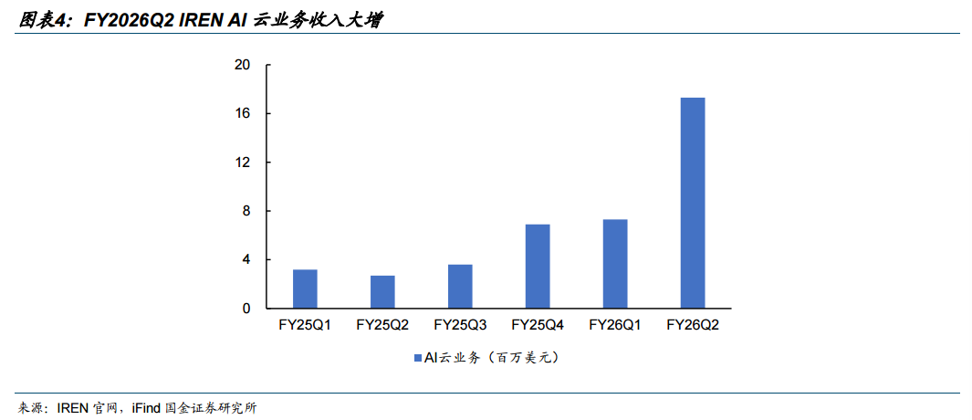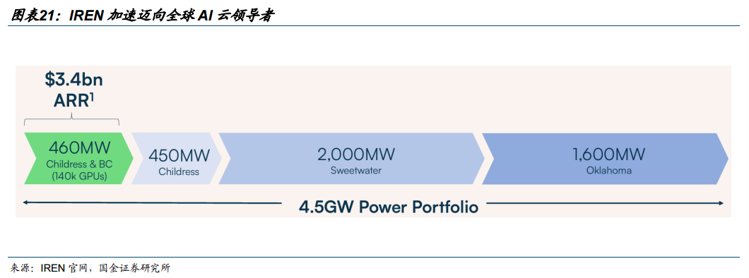 IREN:从加密矿厂加速转型为AI云服务商。公司以比特币挖矿为传统主力业务,2023年起公司凭借能源和基础设施方面的优势,进军AI云服务领域,提供面向人工智能训练和高性能计算的云端算力租赁服务,和数据中心解决方案。1)GPU采购能力强:IREN是英伟达的优先级合作伙伴,2026年3月公司与戴尔科技达成35亿美元采购协议,IREN将增购超过5万块英伟达Blackwell架构B300 GPU,将使其持有的GPU总规模大幅扩张至15万块,预计将于2026H2开始分阶段交付。2)与微软达成AI算力采购协议:2025年11月,IREN与微软签署了价值97亿美元的5年期协议,约定向微软提供英伟达GB300芯片的算力服务;作为配套,IREN还与Dell Technologies达成了58亿美元的设备采购协议,用于购买GPU及相关设备,将在未来一年内分阶段部署在IREN位于德克萨斯州Childress的园区。3)电力成本与土地资源优势明显:目前IREN拥有6个自建的数据中心,3个数据中心运行中,公司凭借矿企独特的土地资源优势、电网接入能力、低成本电力获取渠道,提供810MW电力,拥有超4.5GW合同电力,另有2100MW电力建设中、1600MW电力处于开发阶段。