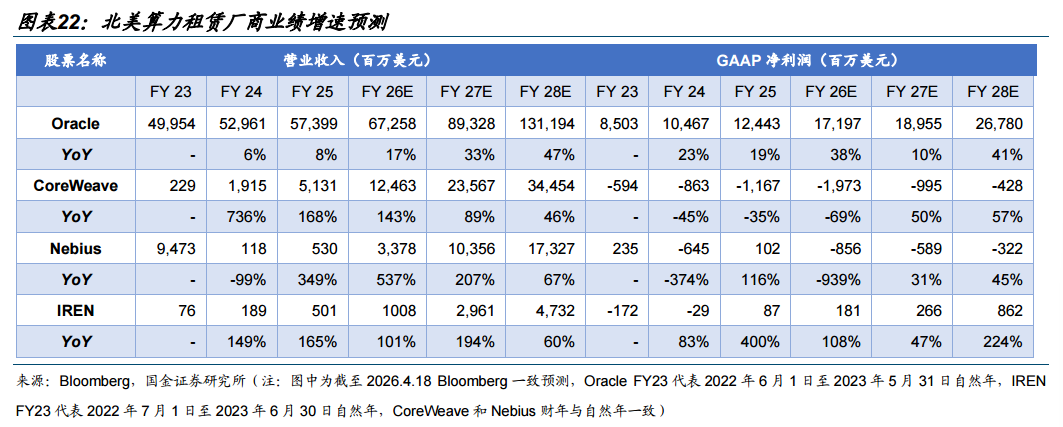 业绩增速方面:四家算租厂商预计均将实现高速增长。Oracle在本身基数较高的基础上,预计营业收入同比增速将从FY26E的17%提升至FY28E的47%;新兴AI云厂商的预测增速相对更高,CoreWeave预计FY25与FY26E将分别维持168%和143%的同比增长,Nebius在FY26E的营收增速预计为537%,IREN预计FY27E营收增速为194%。