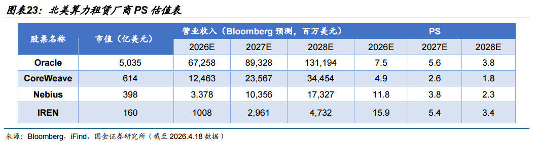 估值水平方面:预期营收的增加带动远期PS逐步下降。根据Bloomberg 预测,以2026E营收计算,各厂商的PS分别为:CoreWeave 4.9 倍、Oracle 7.5倍、Nebius 11.8倍、IREN 15.9倍。随算力租赁收入爆发,各家厂商的远期PS呈现下降趋势,至2028E,CoreWeave的PS预计将下降至1.8倍,Nebius与IREN的PS预计分别降至2.3倍和3.4倍,Oracle的PS预计降至3.8倍。