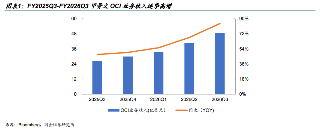 Oracle 26Q3业绩全面超预期,算力租赁业务商业闭环。甲骨文FY26Q3实现总营收171.90亿美元,同比增长21.66%,超出预期1.78%;非GAAP口径下的调整后营业利润为73.78亿美元,同比增长19.10%。1)收入结构方面:云计算&本地部署软件业务实现营收150.33亿美元,同比增长23.87%;云业务收入同比增长44%达到89.14亿美元,其中,OCI业务收入表现亮眼,同比高增84%达到48.88亿美元,超出预期3.12%;OCA业务收入同比增长13%达到40.26亿美元。2)AI大单推动RPO强劲增长:FY26Q3公司剩余履约义务(RPO)高达5530亿美元,同比增长325%,较FY26Q2环比增长290亿美元,主要增量源于大规模AI合同。3)营收指引乐观,云基础设施业务维持高景气:公司预计FY26Q4营业收入同比增长19%-21%,云业务总营收同比增长46%-50%;公司维持2026财年总营收670亿美元的指引,同时上调2027财年总营收预期至900亿美元。
