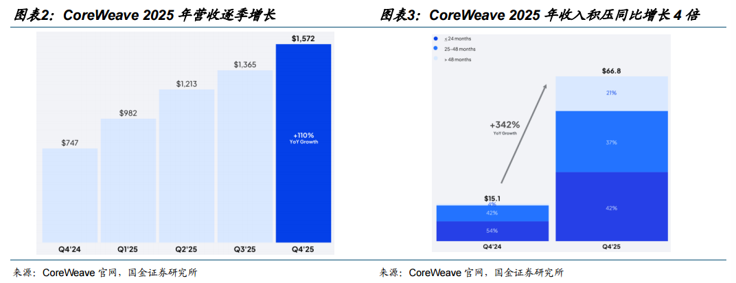 CoreWeave正以惊人的增长速度和庞大的订单积压重塑云市场格局。CoreWeave FY25 Q4收入为16亿美元,同比增长110%。对CoreWeave云的需求持续增长,截至第四季度末,积压订单达到668亿美元,仅25年就增长了四倍以上。CoreWeave是历史上最快达到50亿美元年收入的云服务提供商。2025年,CoreWeave营收超51亿美元,同比增长168%;签约收入储备(backlog)增长至668亿美元,环比增长112亿美元,同比增长超过500亿美元,激活电力容量超过850兆瓦,第四季度新增的预留实例客户数量创历史新高。全年来看,承诺在CoreWeave Cloud上消费至少100万美元的客户数量增长了近150%。2025 年,CoreWeave签订了近 2 吉瓦的额外电力合同,使年底的合同总容量超过 3.1 吉瓦,预计其中绝大部分将在 2027 年底前投入使用。截至2月,CoreWeave已向客户交付了超过 5 万颗 Grace Blackwell 芯片。预计2026年全年,CoreWeave的营收将在120亿至130亿美元之间,按中点计算,同比增长约140%。