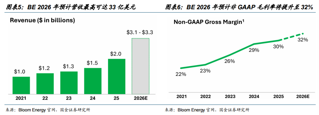 Bloom Energy SOFC原生适配800V架构,AI电力租赁业务积极。Bloom Energy 2025Q4实现总营收7.78亿美元,同比增长36%,AI数据中心需求与C&I(工商业)市场显著放量。1)在手订单量翻倍:截至2025年末总积压订单约200亿美元,其中产品订单积压约60亿美元,同比增长约2.5倍,服务订单积压约140亿美元,同比增长约1.5倍;积压订单中包含Hyperscalers等6家超大规模云服务商,客户结构开始向AI领域倾斜,SOFC需求区域向加州以外低电价地区扩张。2)燃料电池企业基因驱动,电力租赁业务天然技术优明显:公司原生支持800V DC,实现无电池负荷跟随,提供冷热电联供解决方案,具备快速部署、高效能、低成本等差异化优势。3)收入指引彰显信心:2026年公司目标营收31-33亿美元,同比增长超过50%,预计非GAAP毛利率约32%;公司系统有望实现在不需要电池的情况下,完成AI负载快速波动的处理,竞争力进一步凸显。
