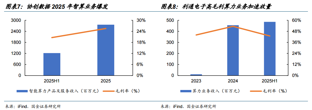 协创数据:2025智算业务爆发,2026Q1利润弹性全面释放。2025年公司实现营收122.36亿元,同比高增65.13%;其中,智能算力产品及服务业务实现收入27.61亿元,同比大增1727.17%。2025年公司持续推进算力服务器及集群解决方案落地,已在北京、上海、乌兰察布、廊坊、中卫、广州、深圳、宁波等多地部署并运营算力中心,重点服务于头部互联网公司模型训练推理、自动驾驶、生物医药等领域客户。随着前期布局的多个算力集群及服务项目陆续完成交付、顺利通过验收并进入计费阶段,2026Q1智能算力产品及服务业务板块的创收能力得以集中释放,据公司业绩预告,公司预计2026Q1实现归母净利润6.5-8.5亿元,同比增长284.14%-402.33%;扣非净利润6.45-8.45亿元,同比增长289.92%-410.82%,收入与利润规模将实现大幅度增长。