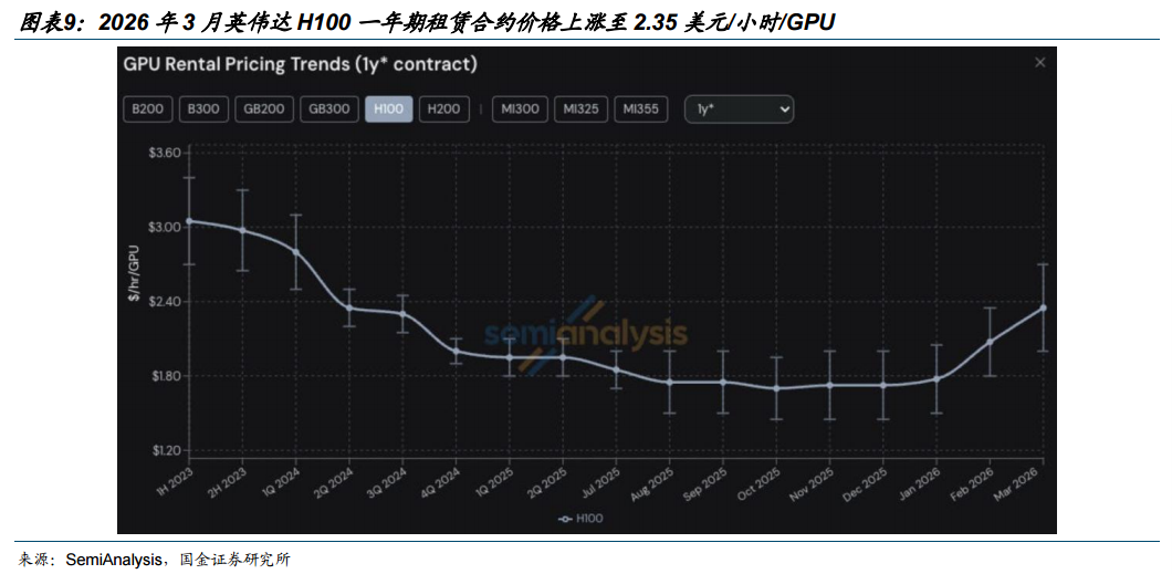 供给侧:英伟达全系列GPU租赁价格上涨,算力短缺程度持续升温。据纽约数据提供商Ornn,近几个月来,英伟达全系列GPU在云端数据中心的现货租赁价格均大幅上涨,Blackwell系列芯片单小时租金已达4.08美元,较两个月前的2.75美元上涨48%。据SemiAnalysis,英伟达H100的一年期租赁合约价格已由2025年10月的低点约1.70美元/小时/GPU,上涨至2026年3月的2.35美元/小时/GPU,涨幅近40%;该机构调研显示,受访GPU供应商中半数表示英伟达H系列芯片无货,2026年8-9月前上线的新一代Blackwell系列产能已被全部预订。芯片价格持续走强、交付周期拉长,算力供给瓶颈仍未缓解。