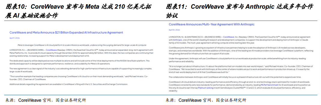 需求侧:算力持续紧俏,巨头加紧锁定长期算力供应。4月9日,Meta与CoreWeave签署价值约210亿美元的算力供应合同,覆盖期限从2027年延续至2032年12月,该合同为2025年9月双方签订的142亿美元合同的进一步扩展,累计承诺金额高达352亿美元,以支持Meta的AI推理工作负载,并包括NVIDIA Vera Rubin平台的首次部署。4月10日,Anthropic与CoreWeave签署多年协议,租用CoreWeave美国数据中心内的英伟达GPU算力,用于支撑Claude模型的开发与大规模部署,计划于2026年下半年开始分阶段上线。