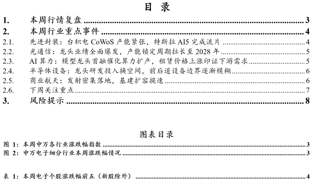 下周关注重点:1)业绩与公告:4月22日特斯拉发布Q1财报,4月23日英特尔、SK海力士发布Q1财报。2)产业事件:4月20日华为Pura系列及全场景新品发布会;4月22-24日谷歌Cloud Next大会;4月22日台积电年度技术研讨会;4月23-25日九峰山论坛;4月20-22日先进封装国际会议;4月22-24日OPIE'26光学与光子学国际展览。3)市场动态:关注DeepSeek V4发布进展。