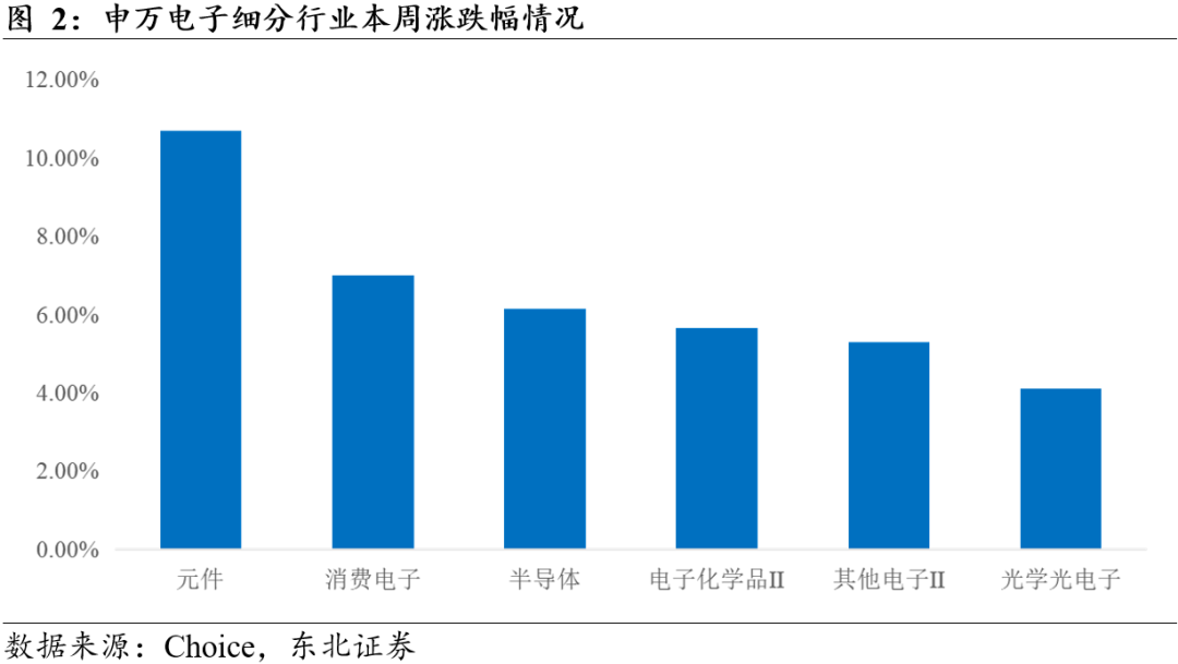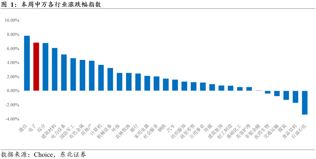 本周上证指数涨幅2.74%,深证成指涨幅7.16%,科创板综指涨幅6.91%,创业板指涨幅9.50%。申万电子指数周涨幅6.84%,在31个子行业中排名2。